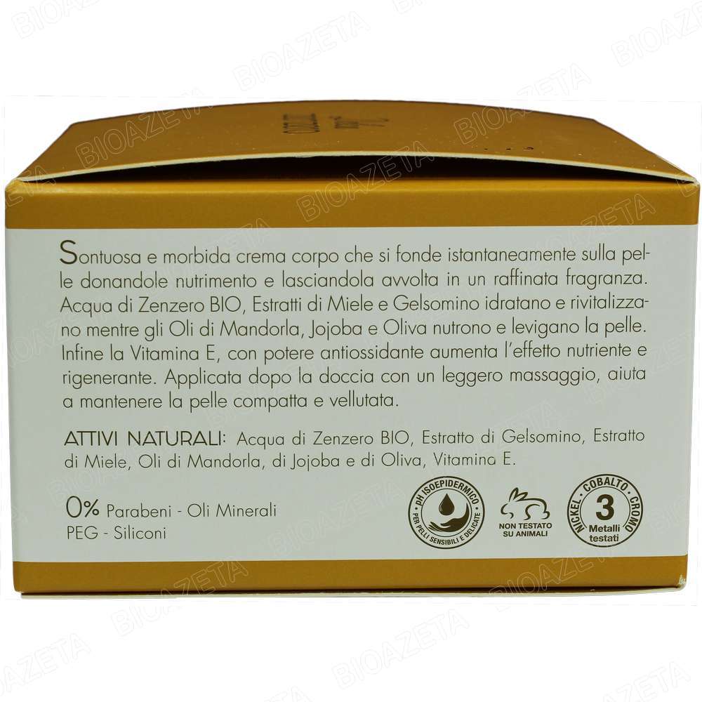 Sontuosa e morbida crema corpo che si fonde istantaneamente sulla pelle donandole nutrimento e lasciandola avvolta in un raffinata fragranza. Acqua di Zenzero BIO, Estratti di Miele e Gelsomino idratano e rivitalizzano mentre gli Oli di Mandorla, Jojoba e Oliva nutrono e levigano la pelle. Infine la Vitamina E, con potere antiossidante aumenta l’effetto nutriente e rigenerante. Applicata dopo la doccia con un leggero massaggio, aiuta a mantenere la pelle compatta e vellutata.