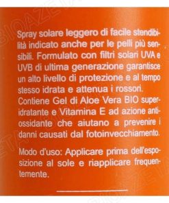 Amerigo spray solare SPF 50 200ml; Spray solare leggero di facile stendibilità indicato anche per le pelli più sensibili. Formulato con filtri solari UVA e UVB di ultima generazione garantisce un alto livello di protezione e al tempo stesso idrata e attenua i rossori. Contiene Gel di Aloe Vera BIO superidratante e Vitamina E ad azione antiossidante che aiutano a prevenire i danni causati dal fotoinvecchiamento.