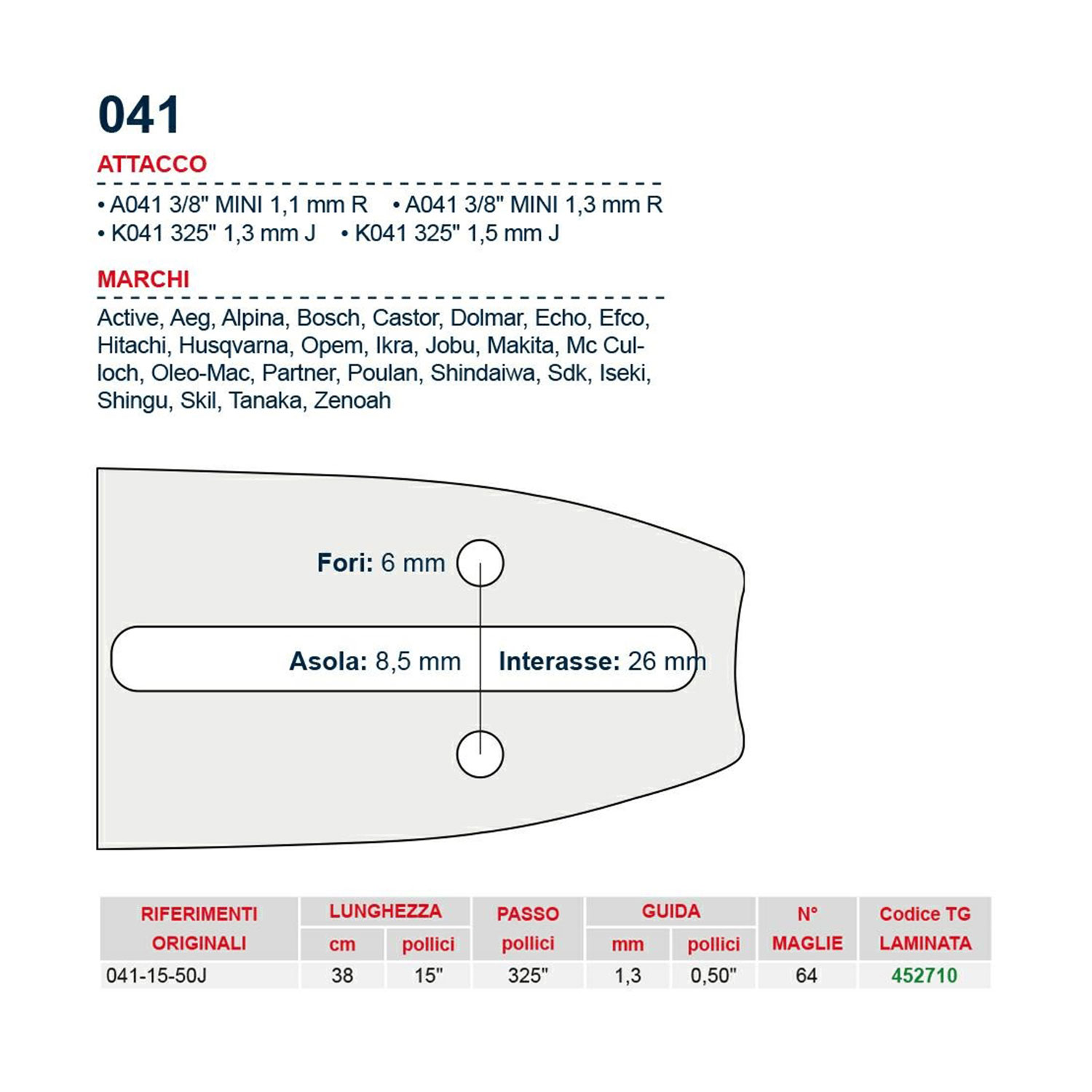 Barra 38 cm – 15″ passo .325″ Spessore 1.3 mm – .050″ attacco 041