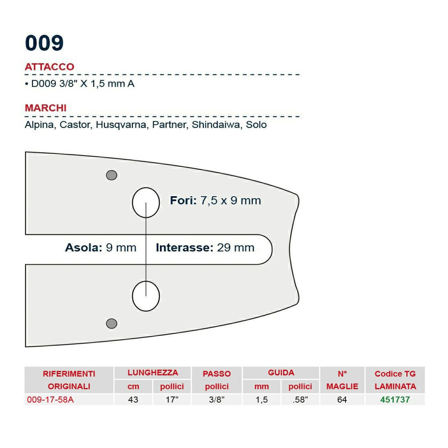 Barra motosega 43 cm – 17″ passo 3/8″ Spessore 1.5 mm – .058″ attacco 009 – 451737