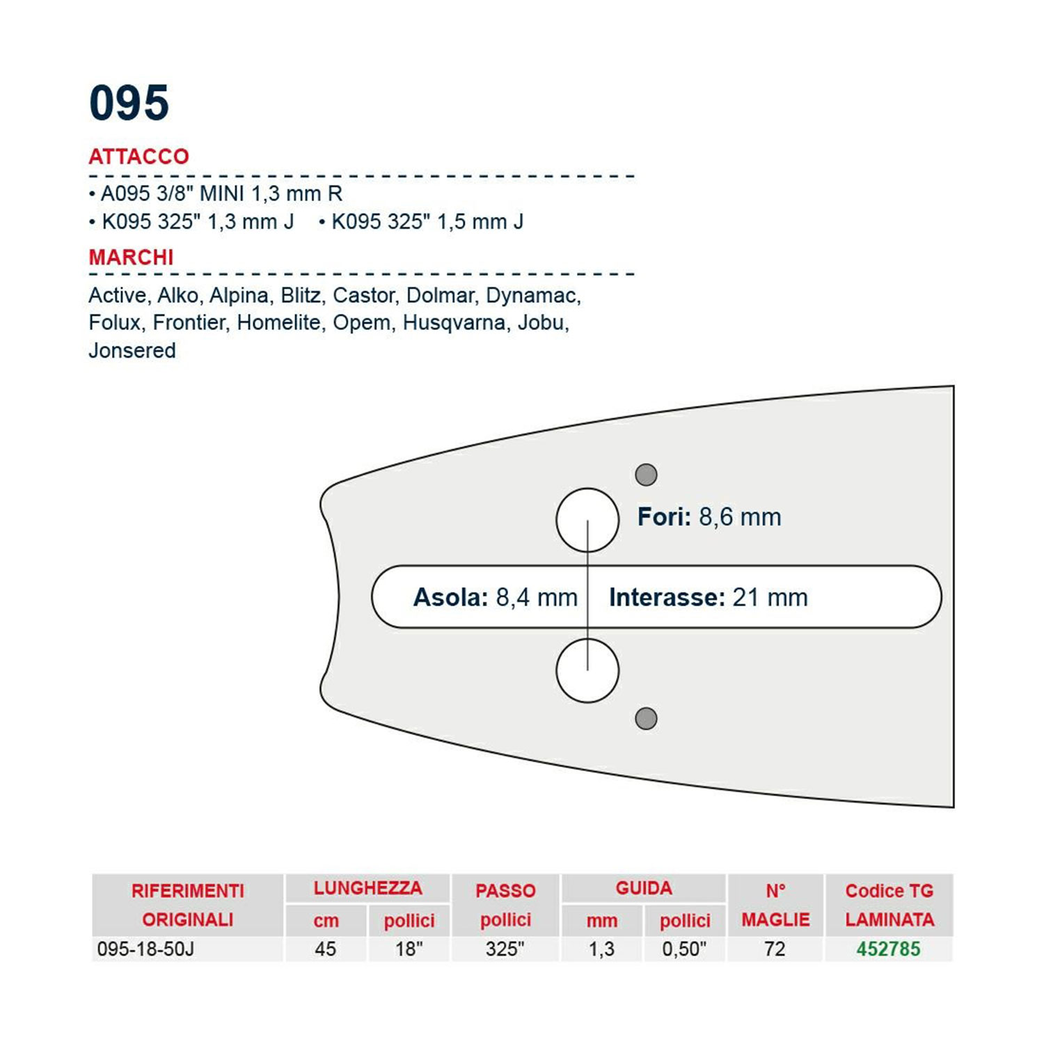 Barra motosega 45 cm – 18″ passo .325″ Spessore 1.3 mm – .050″ attacco 095 – 452785