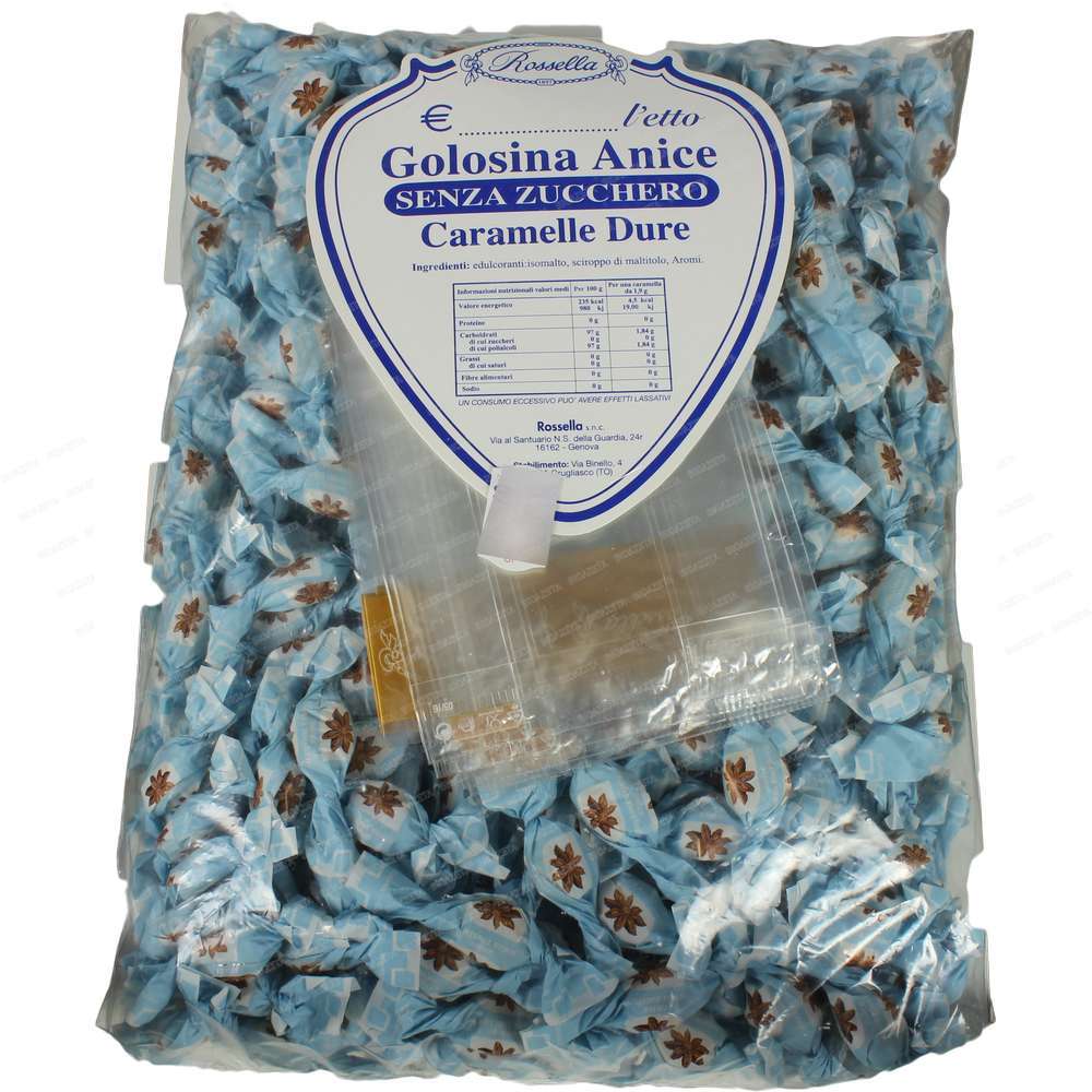 Caramelle anice senza zucchero 500g; Golosina di Rossella storica azienda nata nel 1897 Santo Rossello, recuperando da antichi testi di confetteria la ricetta del fondant, iniziava la produzione di bonbons finissimi identici a quelli che ancora oggi Rossella produce.