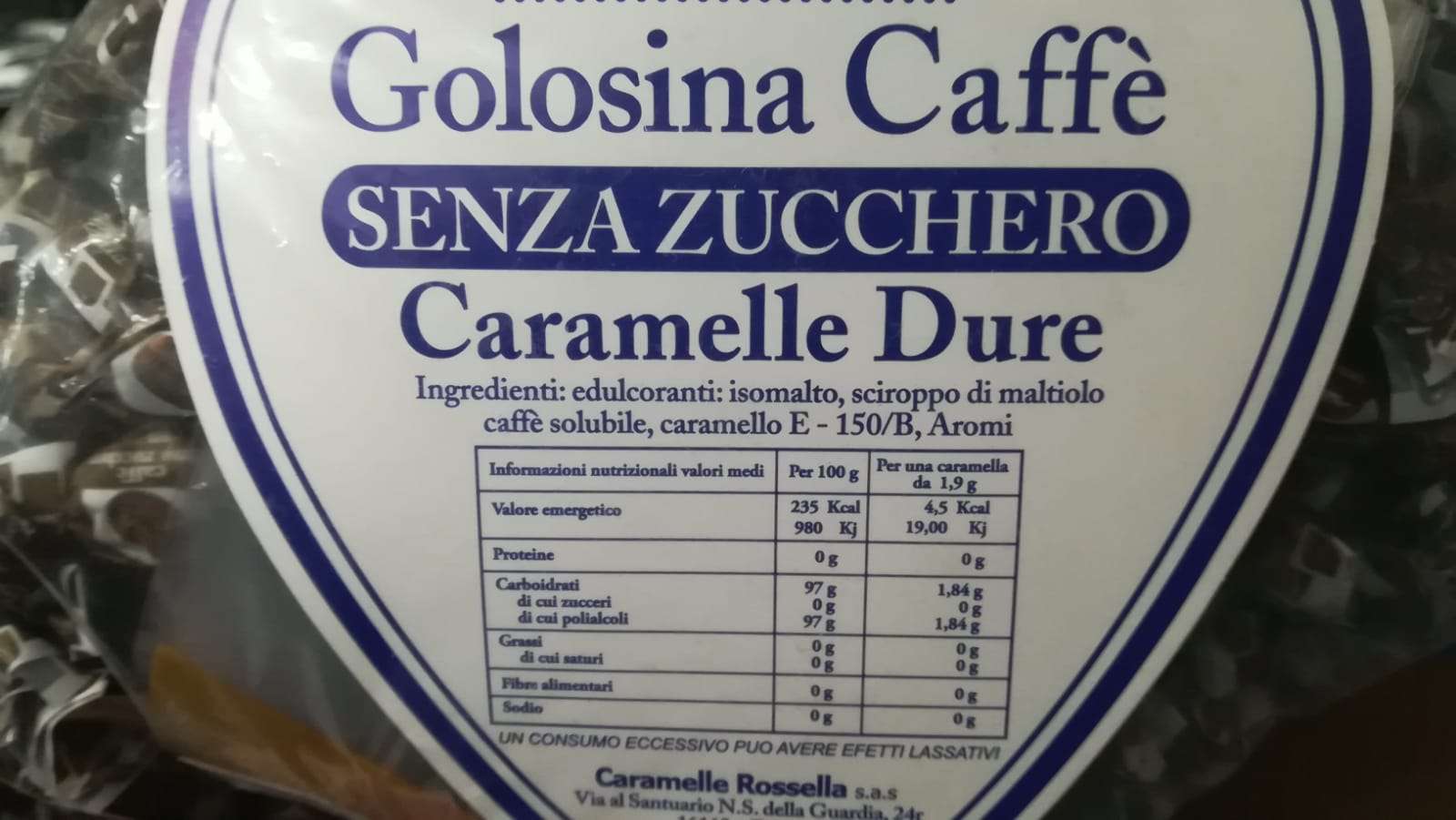 Caramelle caffè senza zucchero 500g; Golosina di Rossella storica azienda nata nel 1897 Santo Rossello, recuperando da antichi testi di confetteria la ricetta del fondant, iniziava la produzione di bonbons finissimi identici a quelli che ancora oggi Rossella produce.