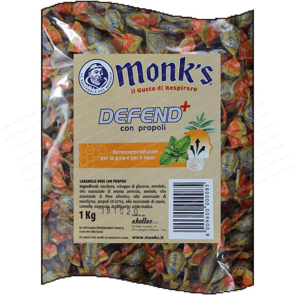 Caramelle Monk’s defend+propoli 500g. In essa è contenuta la propoli delle api, sostanza di origine vegetale utilizzata fin dai tempi antichi per curare le affezioni delle vie respiratorie. Ottimo rimedio naturale per l’igiene orale: antinfiammatorio e anticarie