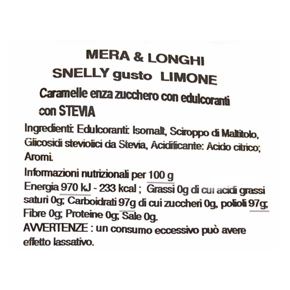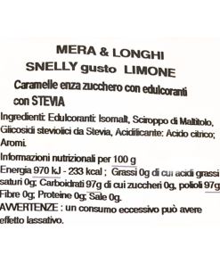 Tired of the same bland-tasting sugar-free sweets? Then you absolutely must try the Mera & Longhi Limone! These candies combine a bright, refreshing lemon flavor with a subtle sweetness, all without sugar and low in calories. Why choose them? Intense Flavor: Immerse yourself in a whirlwind of flavor with their authentic lemon aroma that will leave your taste buds asking for more. Sugar Free: Perfect for those looking to reduce their sugar intake. Natural Sweetness: Sweetened with Stevia, a natural sweetener extracted from the Stevia plant, for guilt-free pleasure. Ideal for any occasion: Practical to always carry with you, they are perfect for a refreshment after meals, a pick-me-up for the throat or a moment of relaxation during the day. Sugar-free candies with sweeteners with STEVIA Sweetener Ingredients Isomalt, Mallitol Syrup, Steviol Glycosides from Stevia, Acidifier: Citric Acid; Flavors. Nutritional information per 100g Energy 970 kJ – 233 kcal; Fat 0g of which saturated fatty acids 0g; Carbohydrates 97g of which sugars 0g, polyols 97g; Fiber 0g, Protein 0g, Salt 0g.