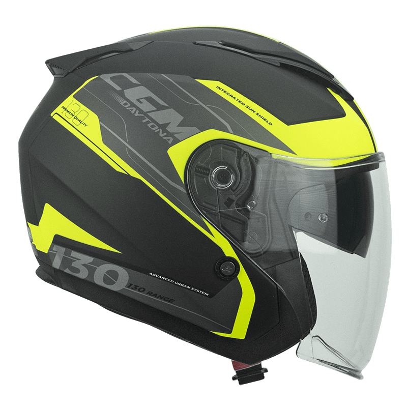 Realizzato con una moderna decal in giallo alta visibilità per la sicurezza passiva, il 130G è un jet dalle linee moderne. Tra le sue caratteristiche ci sono la visiera esterna lunga molto protettiva, l’occhiale interno a scomparsa extrafumé retrattile mediante un comodo meccanismo laterale, il sistema d’areazione completo di prese d’aria anteriori ed estrattori posteriori. Inoltre è dotato di interni dal tessuto tecnico traforato, completamente estraibili e lavabili.