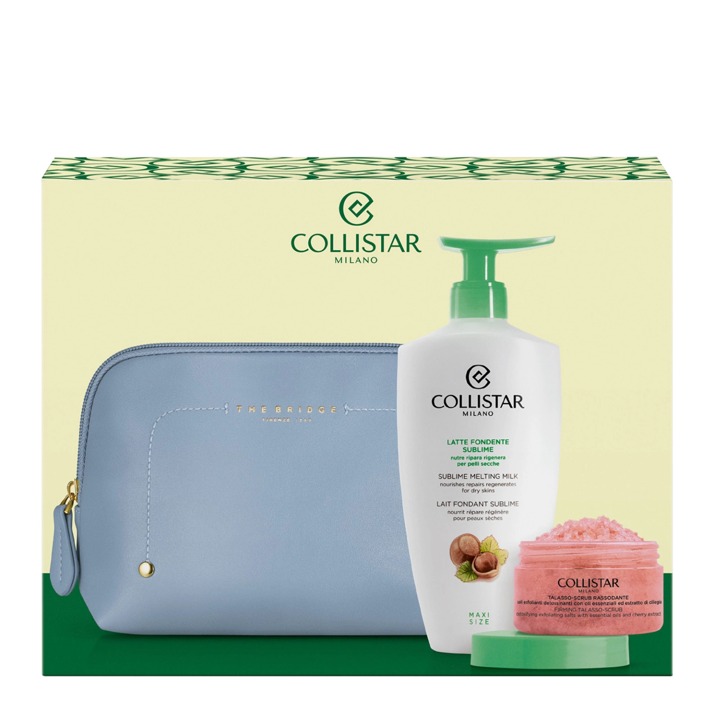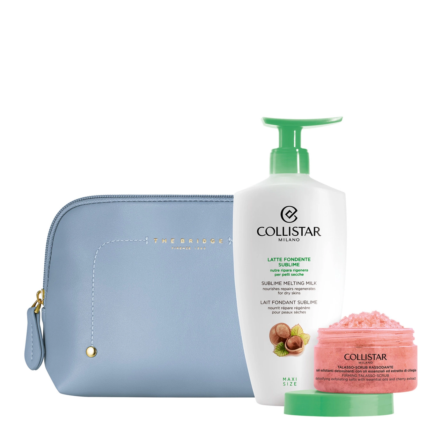The Bridge, eccellenza della pelletteria italiana, firma le esclusive Beauty-Bag dei cofanetti regalo Collistar. Le trousse sono abbinate ai prodotti Collistar più amati: scegli la tua combinazione tra le proposte delle linee Trucco, Viso, Corpo e Uomo. Le Beauty-Bag hanno un design elegante ed essenziale, impreziosito dall’iconico maxi-logo The Bridge sul fronte, richiamo all’heritage del brand.