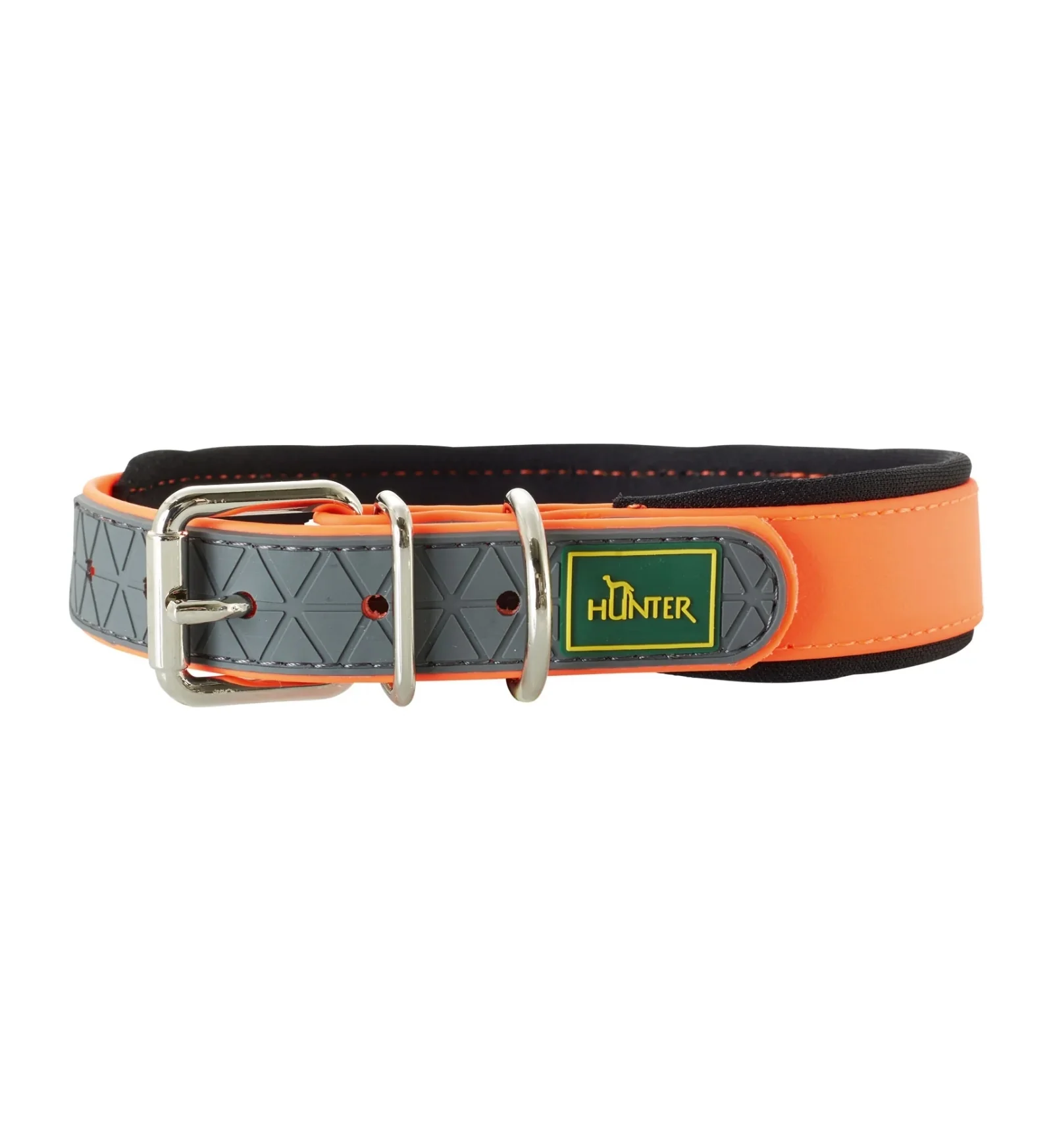 HUNTER CONVENIENCE CONFORTIl collare è fornito di una imbottitura di morbido materiale ergonomico che garantisce un maggiore comfort per il cane e una maggiore salvaguardia del pelo. Il materiale è particolarmente resistente all’acqua ed è a prova di strappo grazie ad un mix forte ed innovativo di materiali sintetici; è facile da pulire ed offre una visibilità ottima in ogni condizione di tempo e su tutti i tipi di suolo.Dettagli:Colore arancioneMisura 35