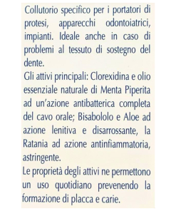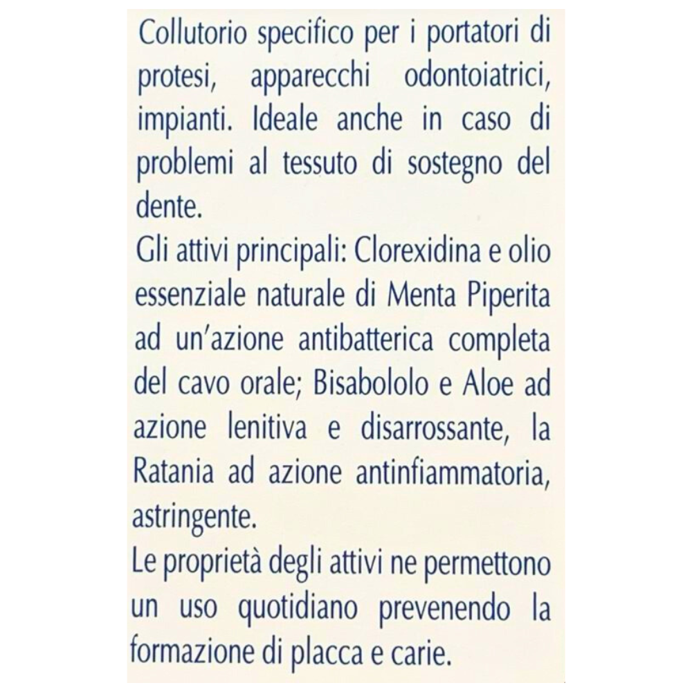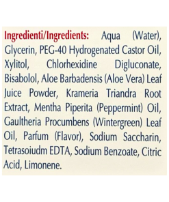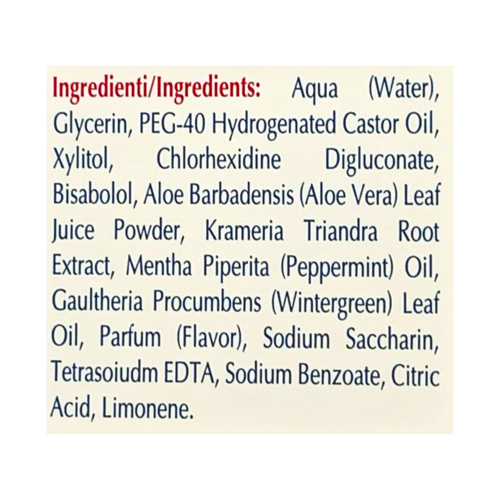 INGREDIENTI / INCI: Aqua (Water), Glycerin, PEG-40 Hydrogenated Castor Oil, Xylitol, Chlorhexidine Digluconate, Bisabolol, Aloe Barbadensis (Aloe Vera) Leaf Juice Powder, Glycyrrhetic Acid, Krameria Triandra Root Extract, Mentha Piperita (Peppermint) Oil, Parfum (Flavor), Potassium Acesulfame, Sodium Benzoate, Citric Acid, Limonene.