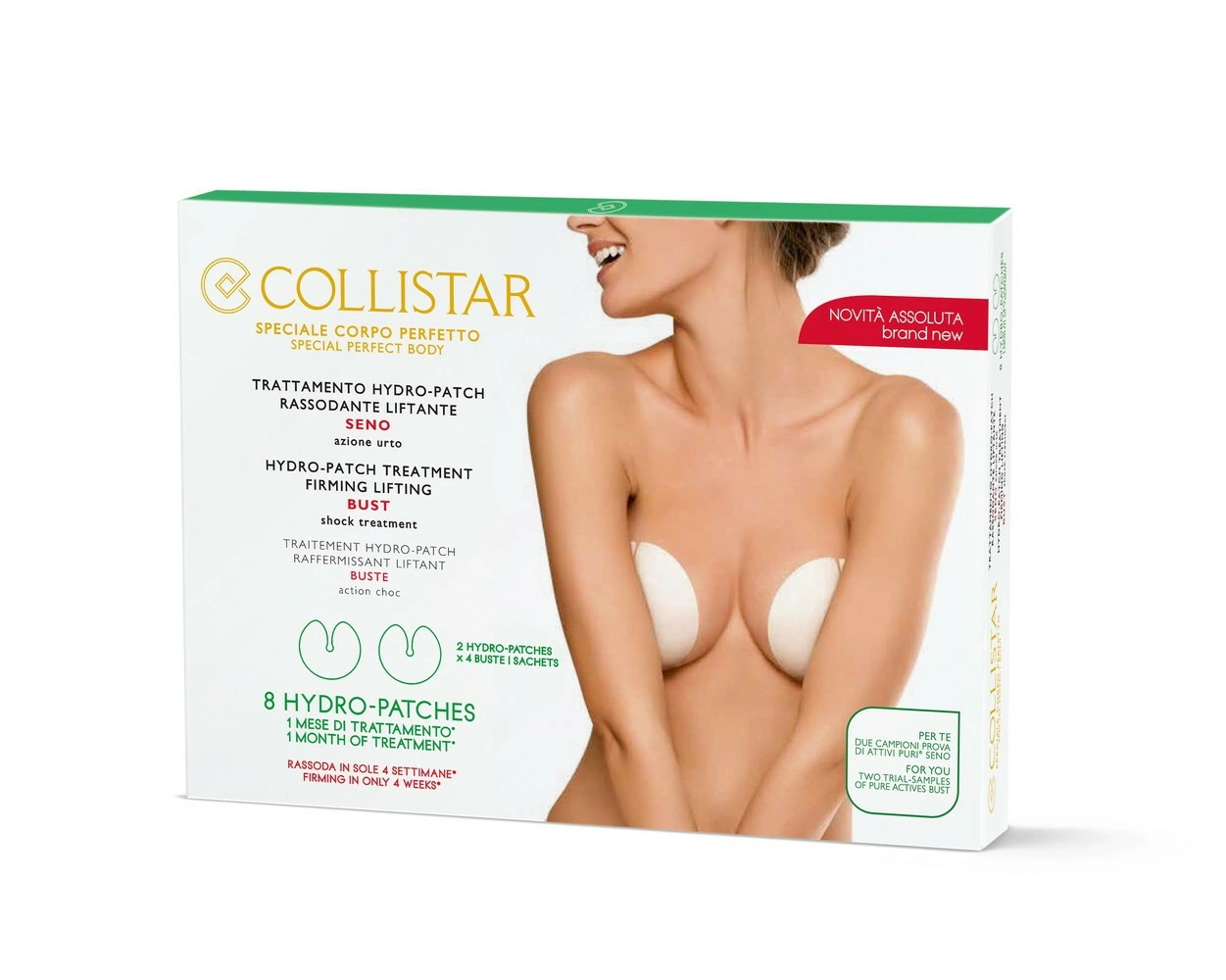 Efficacia. Il patch agisce a 360° sui tessuti cutanei del seno grazie a una calibrata concentrazione di: •Collagene vegetale, ottenuto dalla fermentazione della soia, dall’elevato potere rassodante, ridensificante e ricompattante; •Acido Ialuronico per un’immediata azione liftante ed elasticizzante; •estratto di Ginkgo Biloba e Tè Verde tonificanti e antiossidanti. La formula è inoltre arricchita con estratto di Aloe idrante e lenitivo.