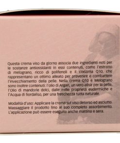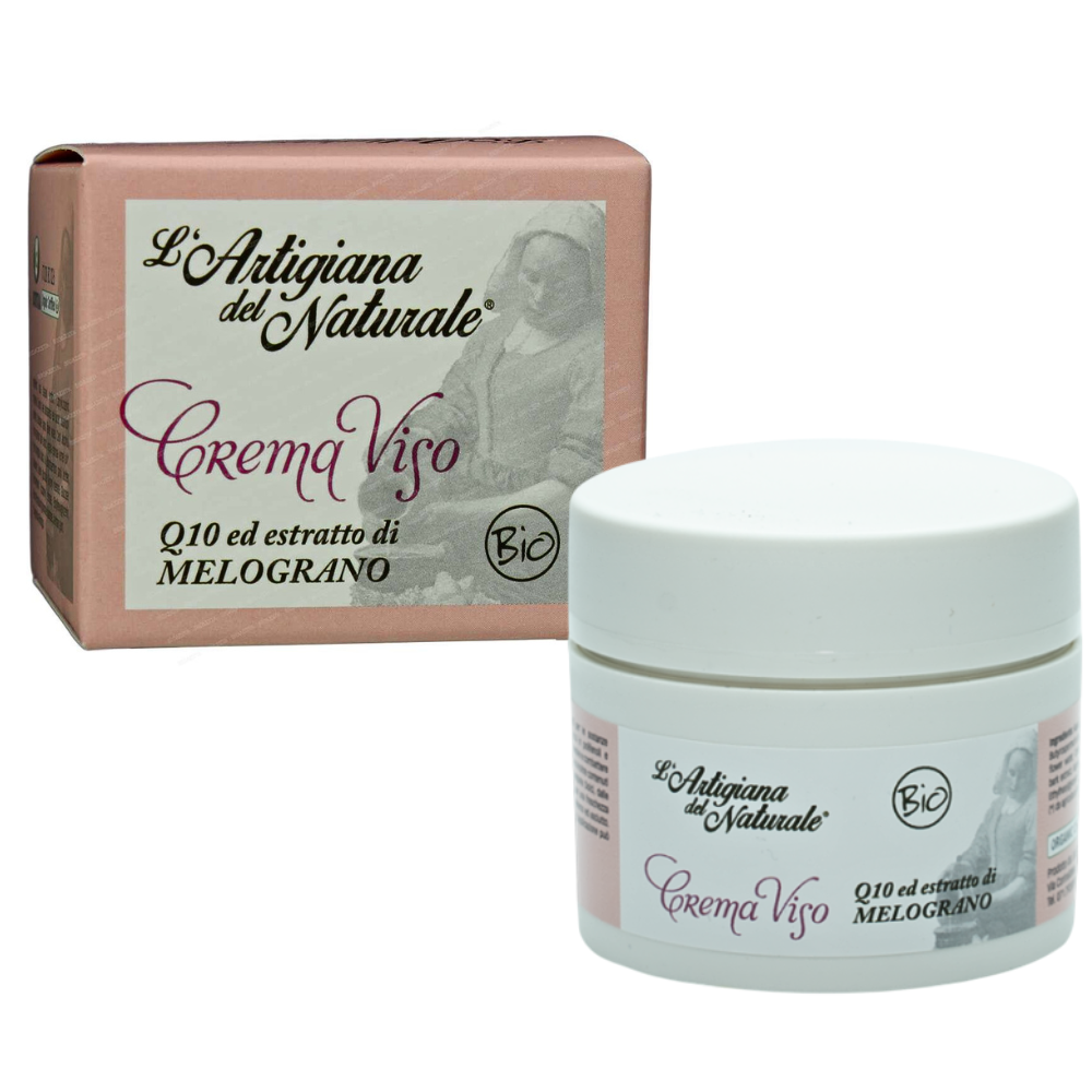 Crema viso q10 e melograno BIO 50ml; Questa crema viso associa due ingredienti noti per le sostanze antiossidanti in essi contenute, come l’estratto di melograno, ricco di polifenoli e il coezima Q10, che rappresentano degli ottimi alleati per prevenire e combattere l’invecchiamento della pelle.