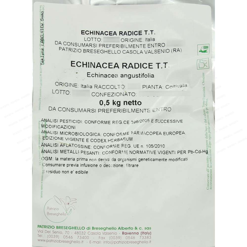 Echinacea angustifolia radice Taglio Tisana 500g, La Patrizio Breseghello, azienda di importazione, lavorazione e commercializzazione di piante, ha la propria sede a Casola Valsenio, in provincia di Ravenna; il “paese delle erbe e dei frutti dimenticati”, dove 450 specie di piante officinali, fanno bella mostra di se in un Giardino delle Erbe. Fra i fattori differenziali e distintivi dell’ azienda vi sono l’approvvigionamento diretto delle materie prime (quando possibile) allo scopo di accorciare la filiera; Le tecniche di lavorazione e conservazione finalizzate all’inalterabilità dei principi attivi; la doppia cernitura (meccanizzata e a mano); la totale assenza di aromi nelle basi composte: spesso utilizzati per conferire gradevolezza al prodotto. Tutti i prodotti (piante officinali, tè e infusi, vegetali in polvere, tisane confezionate e altro), vengono controllati da un laboratorio di analisi prima di essere immessi nel mercato. Sono oltre 200 le specie botaniche selezionate e lavorate dalla Patrizio Breseghello. Ogni fase della trasformazione è condotta con la massima cura e attenzione e ha lo scopo di ottenere il miglior taglio tisana reperibile sul mercato. La cernitura a mano, tratto distintivo dell’azienda, viene effettuata successivamente a quella meccanica con l’obiettivo di rendere ancora più puro il prodotto e distinguibili gli elementi vegetali adeguatamente sminuzzati (foglie, radici, fiori, cortecce). Questa operazione permette di liberare il preparato da ogni impurità ed eventuali scorie estranee alla pianta, consentendo al cliente il triplo beneficio di una formulazione buona, naturale ed efficace. La Patrizio Breseghello attraverso il proprio laboratorio di ricerca e una conoscenza a 360 gradi delle specie vegetali utilizzate, ha ideato una linea di basi composte rispondenti alle più comuni necessità. La composizione di una tisana è una scienza! Tutte le basi di erbe aromatiche ovviamente naturali e prive di organismi geneticamente modificati, possono essere consumate anche come tisane fredde mantenendo inalterate le proprietà.
