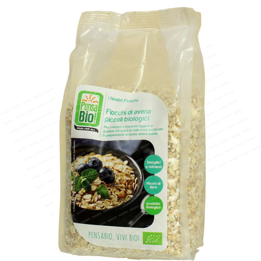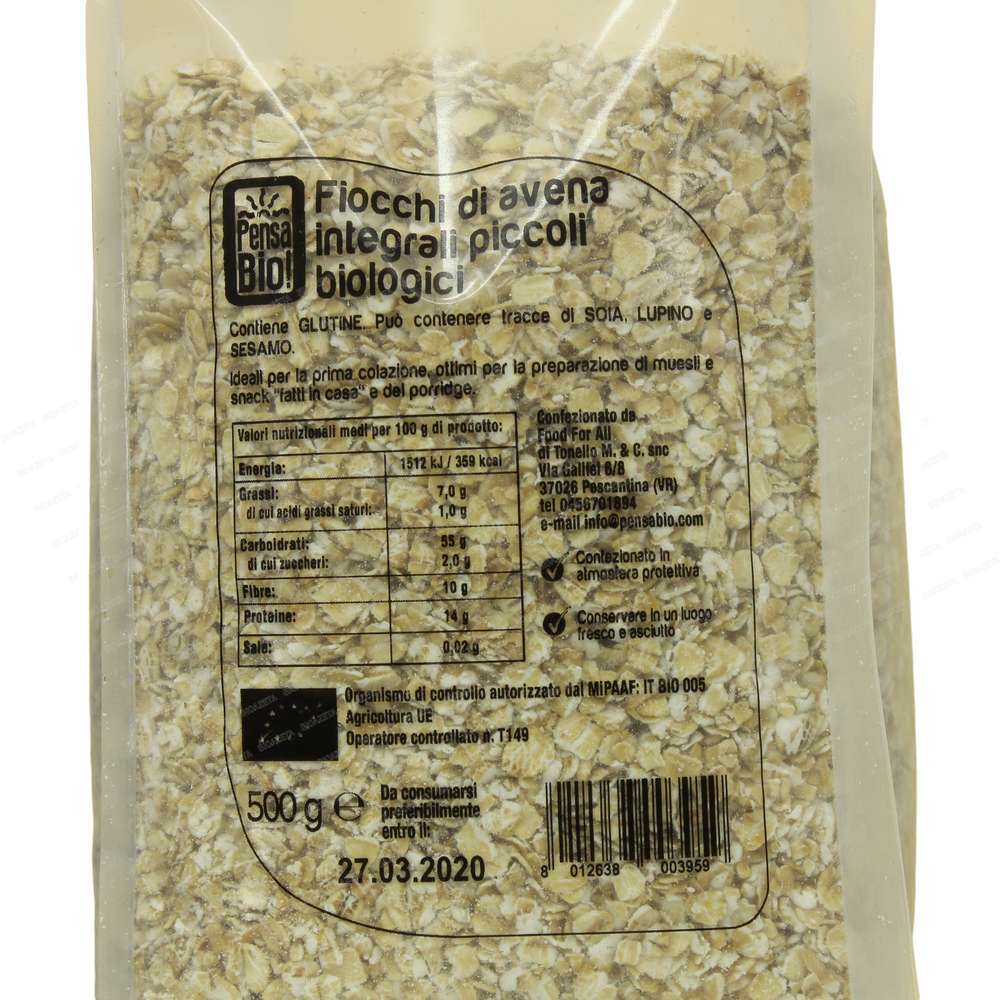 Fiocchi avena piccoli bio 500g Food for All; Ideali per la prima colazione, ottimi per la preparazione di muesli e snack “fatti in casa” e del porridge. Da usare in mille modi anche per ricette dolci e salate. Semplici e nutrienti. Ricchi di fibre.
