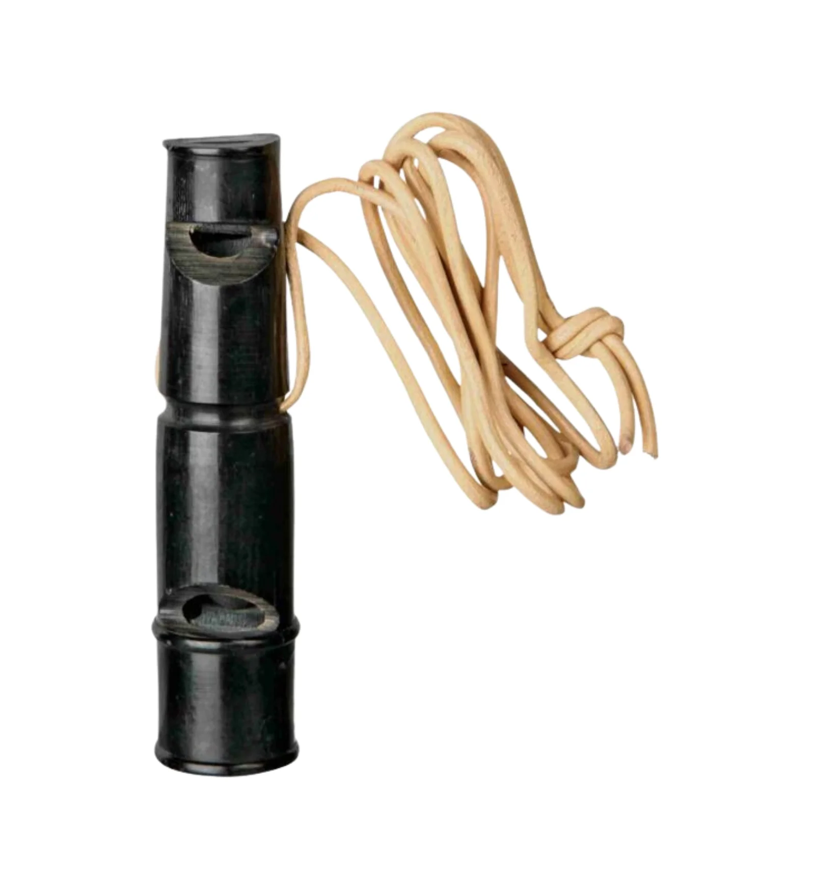 FISCHIETTO IN CORNO DI BUFALO Dettagli:Doppio tono: fischio e trilloIdeale per l’addestramento e la cacciaAdatto per lunghe distanzeCon laccio in pelleMisure: 9 cm
