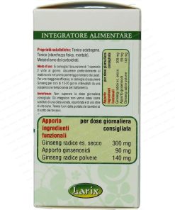 Ginseng 30% opercoli 60 Larix, Ingredienti per opercolo: Ginseng (Panax ginseng C.A. Meyer) radice es. secco (30% ginsenosidi) 150 mg e polvere 70 mg. Opercolo: gelatina vegetale. Contenuto: 60 opercoli vegetali da 300 mg (21 g e) Utile per le sue proprietĂ toniche, ergogeniche e adattogene. Forte energetico. Si consiglia l’assunzione di 1 opercolo 2 volte al giorno. Assumere preferibilmente al mattino e/o nel primo pomeriggio lontano dai pasti. Per una maggiore efficacia, si consiglia di assumere Ginseng per cicli di 15-20 giorni intervallati da una sospensione temporanea del trattamento.