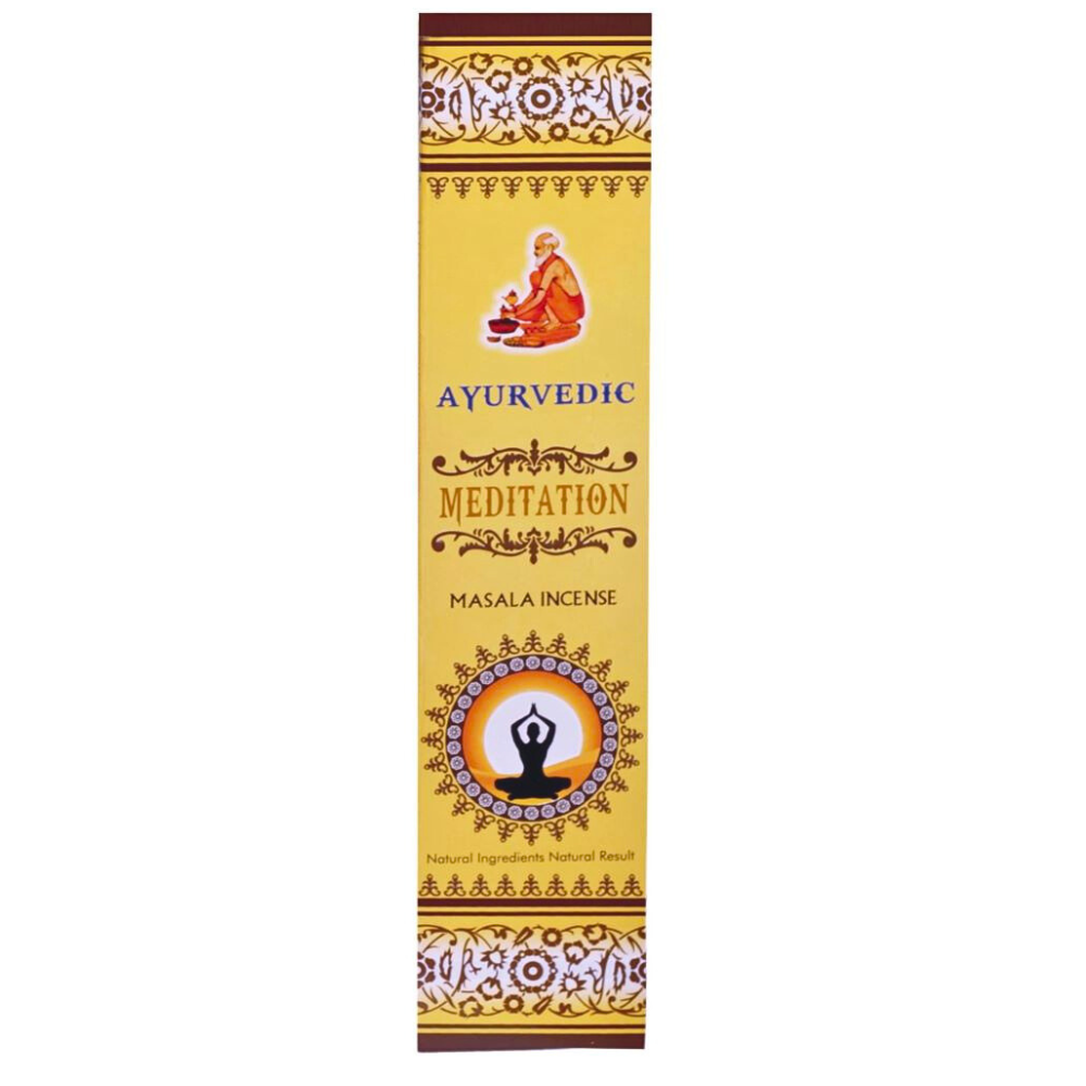 Incenso Masala Ayurvedico Meditazione 15 stick; È privo di materiali tossici che rilascia un aroma calmante quando viene bruciato. I bastoncini di incenso da meditazione incoraggiano la mente a concentrarsi durante la meditazione, oltre ad aiutarti a entrare nella giusta mentalità prima di iniziare, spesso vengono usati insieme al rituale di premeditazione all’inizio di ogni sessione.