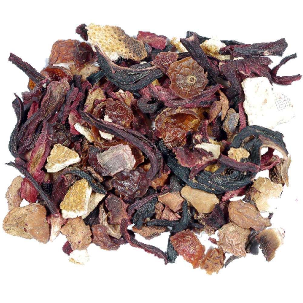 Ingredienti: Miscela di Ibisco, rosa canina, scorza d’arancia, pezzi di mela, aromi.