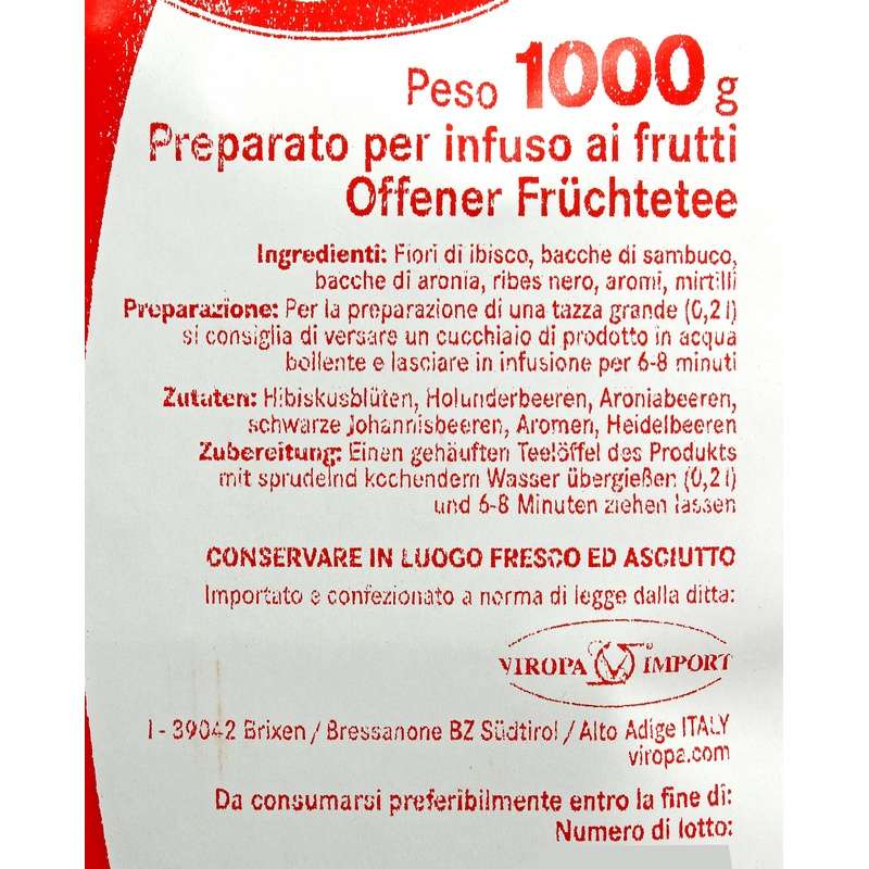 Ingredienti: Fiori di ibisco, bacche di sambuco, bacche di aronia, ribes nero, aromi, mirtilli.