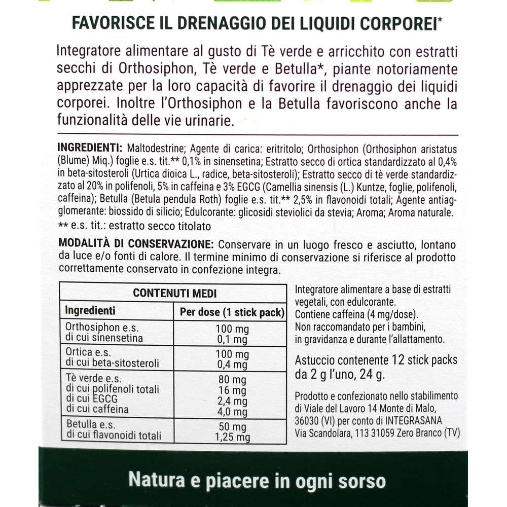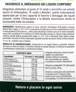 Ingredienti: Maltodestrine; Agente di carica: eritritolo; Orthosiphon foglie estratto secco titolato 0,1% in sinesetina; Estratto secco di Ortica standardizzato al 0,4% in beta-sitosteroli; Estratto secco di Tè Verde standardizzato al 20% in polifenoli, 5% di caffeina e 3% ECCG; Betulla foglie estratto secco titolato 2,5% in flavonoidi totali; Agente antiagglomerante: biossido di silicio; Edulcorante: glicosidi steviolici da stevia; Aroma; Aroma naturale.