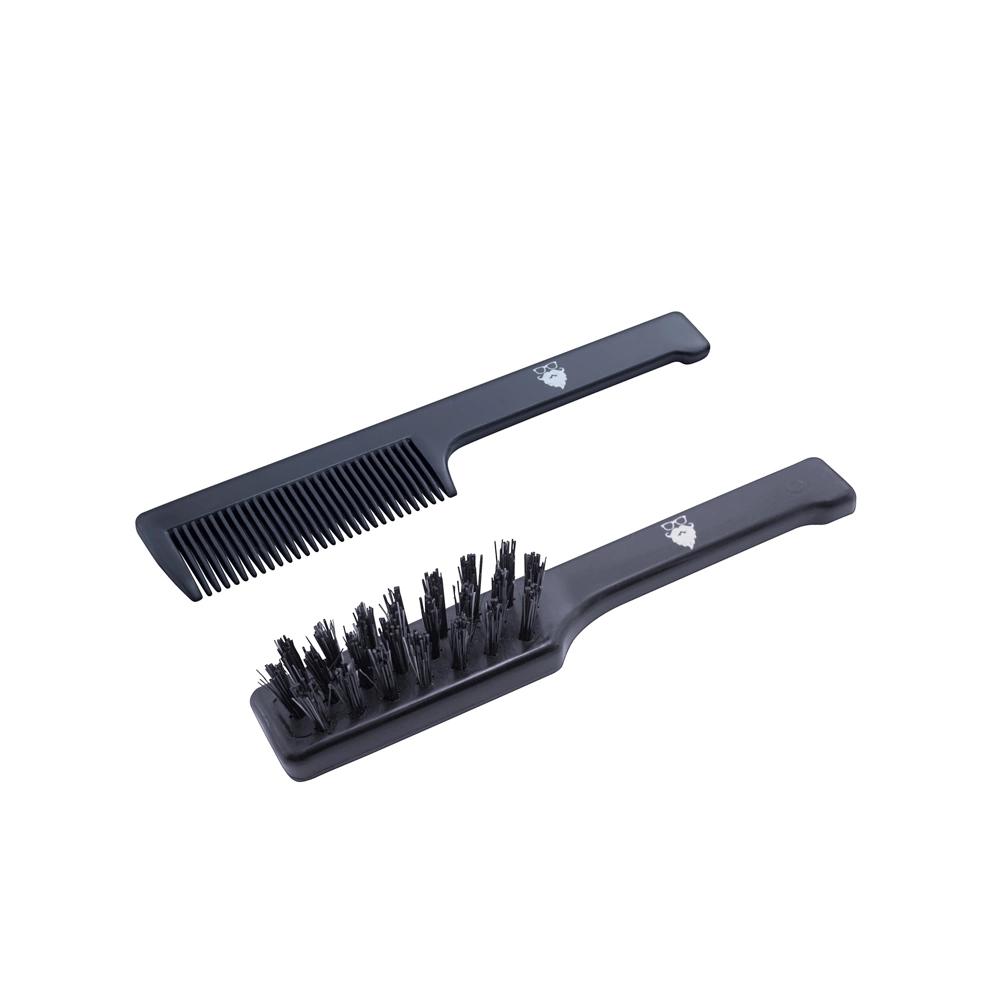 Kit composto da spazzola e pettine. Spazzola districante e pettine modellante. Le particolari setole della spazzola, perfettono di effettuare un leggero scrub, mentre il pettine è indispensabile per lisciare barba e baffi ed è consigliato utilizzarlo per l’applicazione della “cera barba & baffi” e del “gel riflessante”