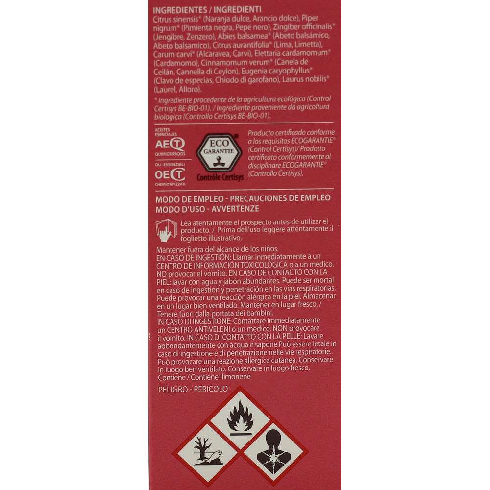 INGREDIENTI – Olio essenziale di: Citrus sinensis* (Arancio dolce), Piper nigrum* (Pepe nero), Zingiber of_ cinalis* (Zenzero), Abies balsamea* (Abeto balsamico),