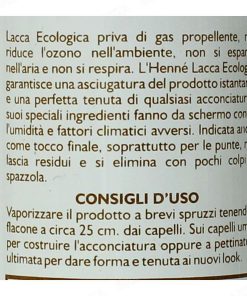 Lacca ecologica + vitamina E 150ml; Priva di gas propellente, non riduce l’ozono nell’ambiente, non si espande nell’aria e non si respira. Garantisce una asciugatura del prodotti istantanea e una perfetta tenuta di qualsiasi acconciatura; i suoi speciali ingredienti fanno da schermo contro l’umiditĂ e fattori climatici avversi. Indicata anche come tocco finale, soprattutto per le punte, non lascia residui e si elimina con pochi colpi di spazzola. Consigli d’uso: Vaporizzare il prodotto a brevi spruzzi tenendo il flacone a circa 25 cm dao capelli. Sui capelli umidi per costruire l’acconciatura oppure a pettinatura ultimata per dare forma e tenuta ai nuovi look. L’HENNE’ NON COLORANTE … la tricologia piĂą aggiornata inserita su un ceppo antico 4000 anni di esperienza… L’hennĂ© è un alberello delle regioni subtropicali, ha rami spinosi con scorza biancastra, foglie ovali acuminate, opposte, e fiori bianchi o rosei in cime terminali, soavemente profumati; il frutto è una capsula globosa. Le foglie secche, contenenti sostanze coloranti aranciate, resine, tannino, sostanze grasse e una essenza non ancora ben identificata, trovano impiego, polverizzate, nella tintura dei capelli e delle unghie. Il loro uso, comunissimo nei paesi Arabi, si è diffuso ovunque. La composizione del derivato delle foglie all’hennĂ© non è stata approfondita; esso contiene comunque: