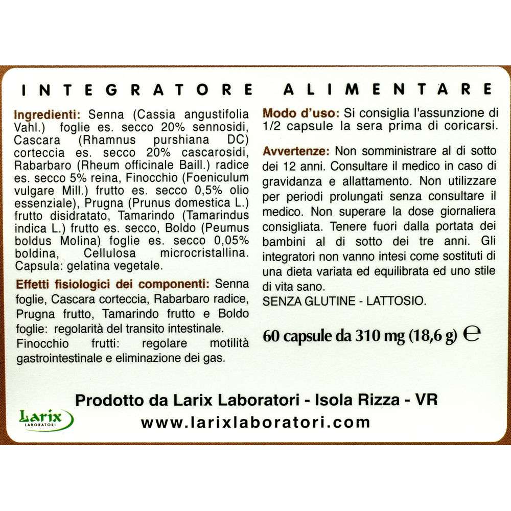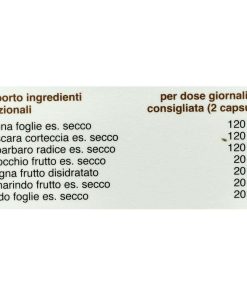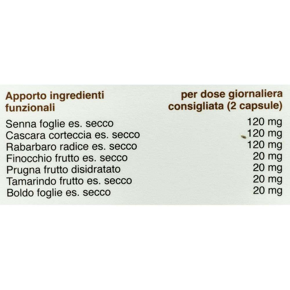 Ingredienti: Senna foglie estratto secco 20% sennosidi, Cascara corteccia estratto secco 20% cascarosidi, Rabarbaro radice estratto secco 5% reina, Finocchio frutto estratto secco 0,5% olio essenziale, Prugna frutto disidratato, Tamarindo frutto estratto secco, Boldo foglie estratto secco 0,05% boldina, cellulosa microcristallina.