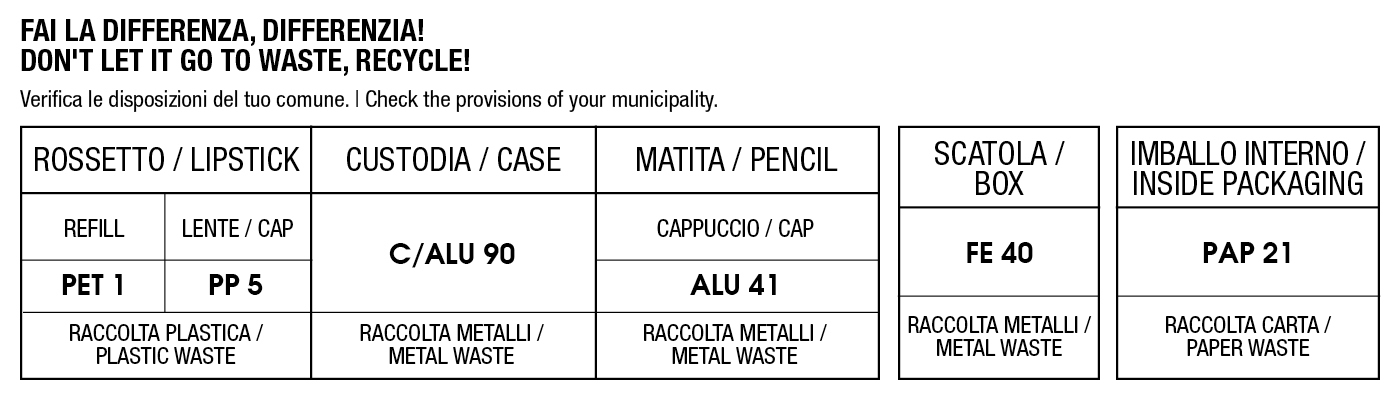 Stay on me lip liner: Matita labbra in plastica temperabile che crea un tratto preciso e straordinariamente adesivo. La sua texture cremosa ed altamente pigmentata, scorre sulle labbra garantendo un rilascio colore super intenso ed omogeneo. Una matita ultra performante e dalle prestazioni eccezionali: long lasting, water resistant e no transfer. Un “must have” nella beauty routine di ogni donna. Le matite abbracciano la sostenibilità, utilizzando una formula vegan e il corpo in Sulapac, un materiale sostenibile a base biologica.