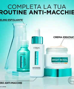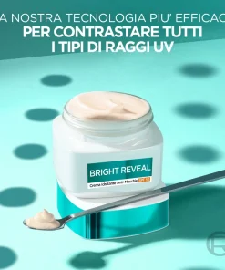 Crema con: – 5,6% complesso idratante – 2% Niacinamide: ingredente illuminante che aiuta a ridurre la visibilità delle macchie – Filtro UV brevettato Mexoryl 400: la nostra prima tecnologia filtrante UV che previene la comparsa di macchie e segni dell’età causati dai raggi UV. Dopo 1 utilizzo la pelle è immediatamente idratata e rimpolpata. Dopo 1 mese le macchie sono visibilmente ridotte, anche quelle più ostinate. La pelle appare più luminosa e l’incarnato più uniforme.