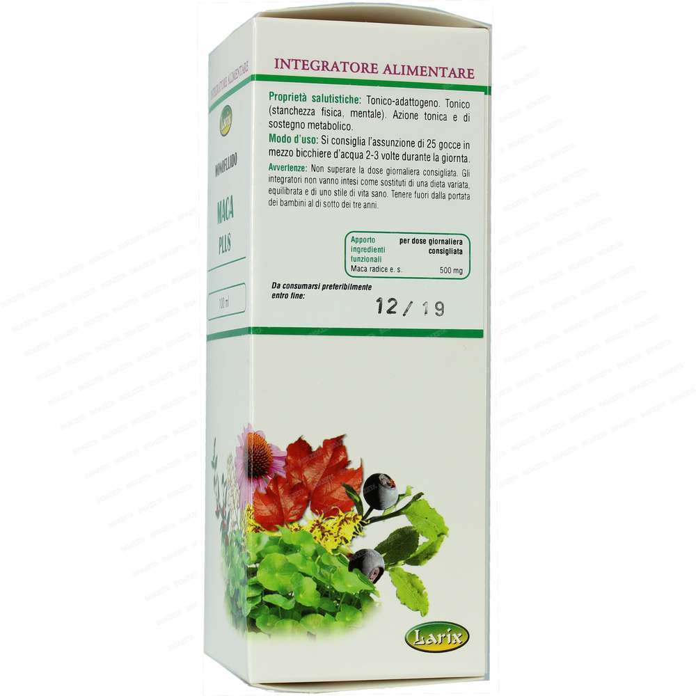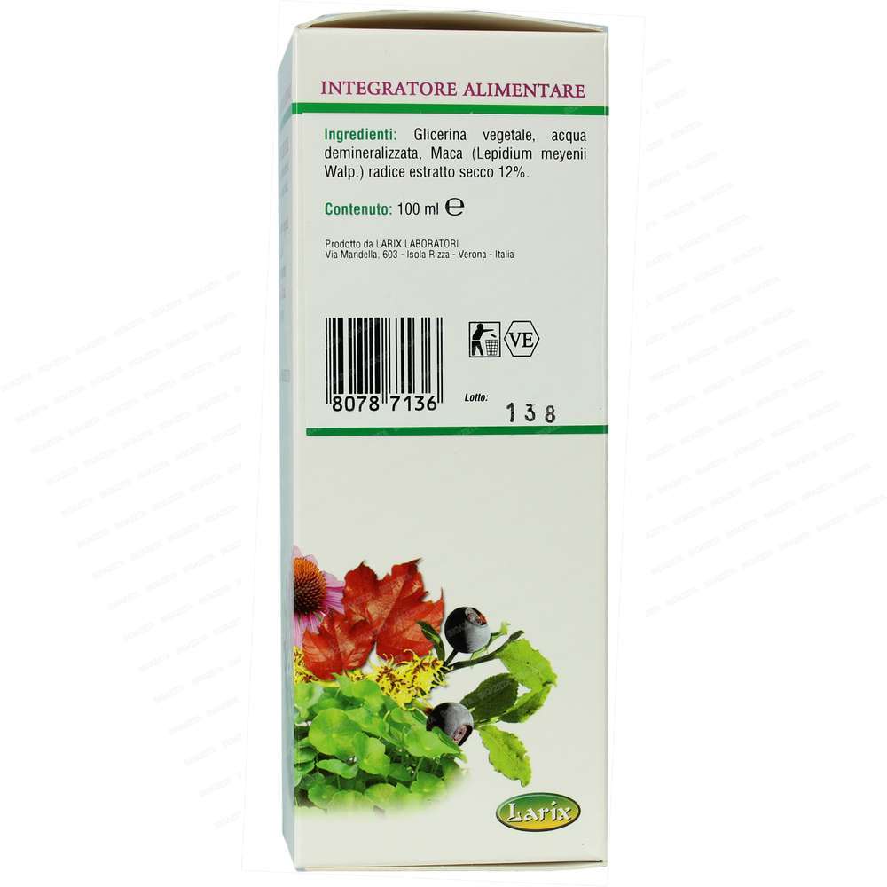 Maca liquida senza alcool 100ml Larix; Ingredienti:Â Glicerina vegetale, acqua demineralizzata, Maca (Lepidium meyenii Walp.) radice estratto secco 12%. Contenuto: 100 ml.