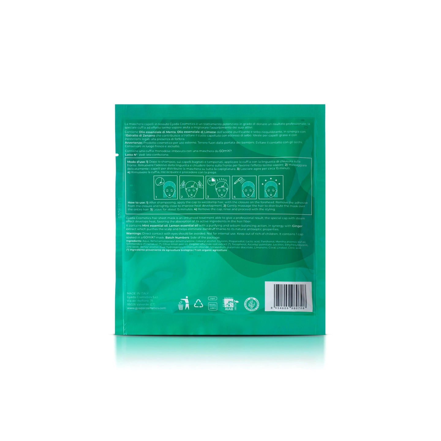La maschera capelli in tessuto Gyada Cosmetics è un trattamento potenziato in grado di donare un risultato professionale; la speciale cuffia ad effetto termico sviluppa calore durante l’applicazione della maschera, favorendo l’assorbimento dei suoi attivi nella fibra capillare. Contiene Olio essenziale di Menta, Olio essenziale di Limone dall’azione purificante e sebo-riequilibrante, in sinergia con l’Estratto di Zenzero che purifica il cuoio capelluto e contribuisce ad eliminare la forfora grazie alle sue proprietà antisettiche naturali. La Cuffia è facilmente lavabile e riutilizzabile. In questo modo, una volta esaurita la Maschera di cui è imbibita, potete utilizzarla successivamente con altre maschere o impacchi per sfruttarne l’effetto Termo-Vapore.