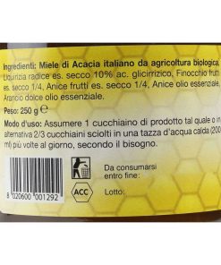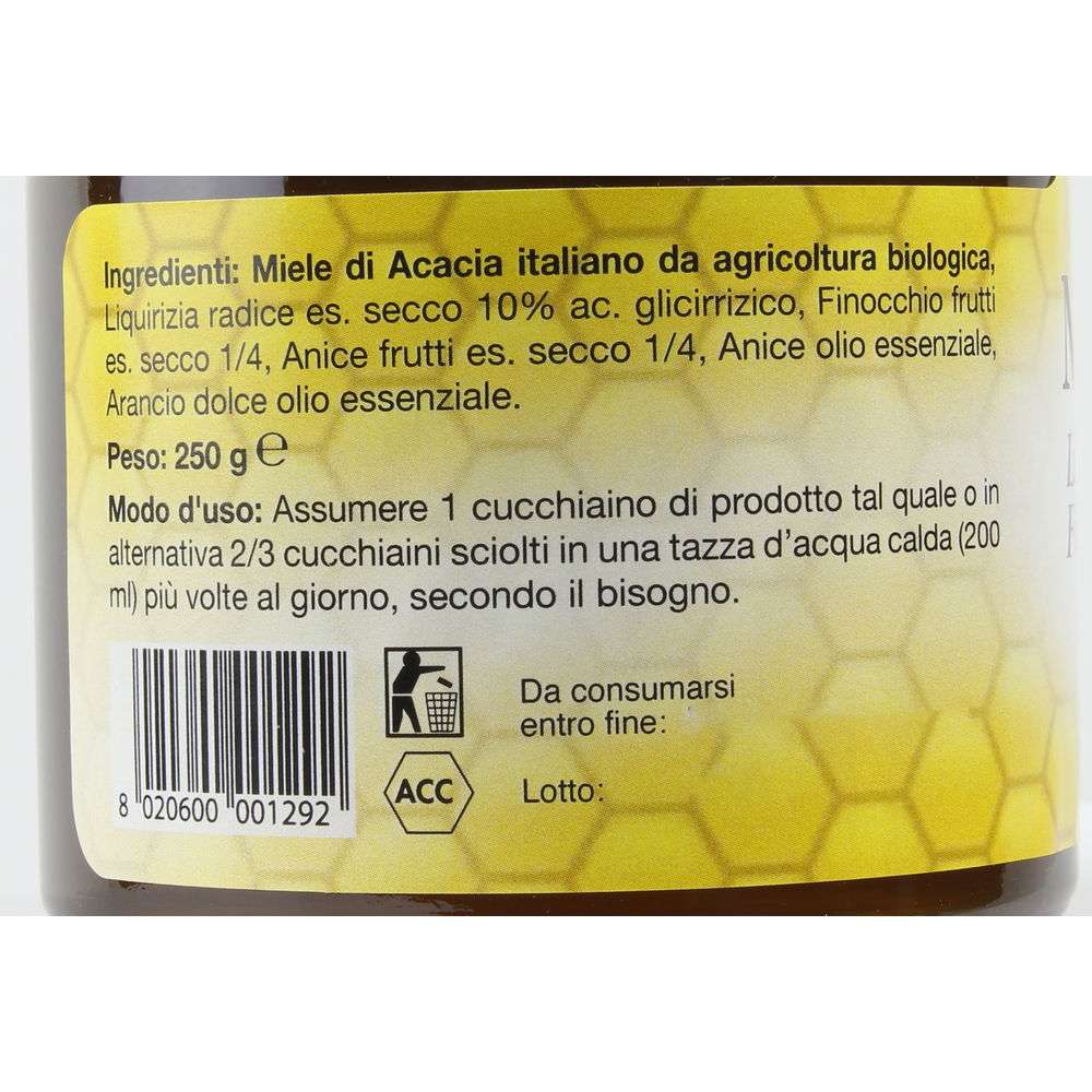 Ingredienti: Miele di Acacia Italiano da Agricoltura Biologica, Liquirizia radice estratto secco 10% acido glicirrizico, Finocchio frutti estratto secco 1/4, Anice frutti estratto secco 1/4, Anice olio essenziale, Arancio dolce olio essenziale.