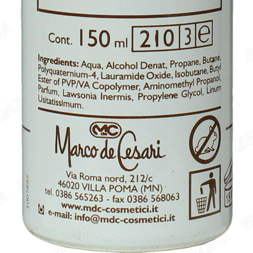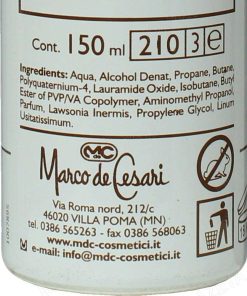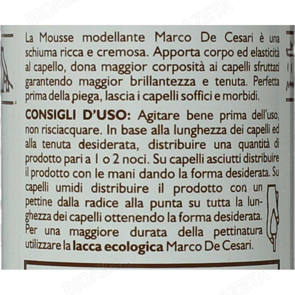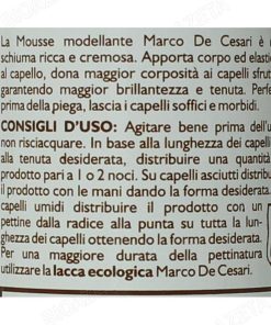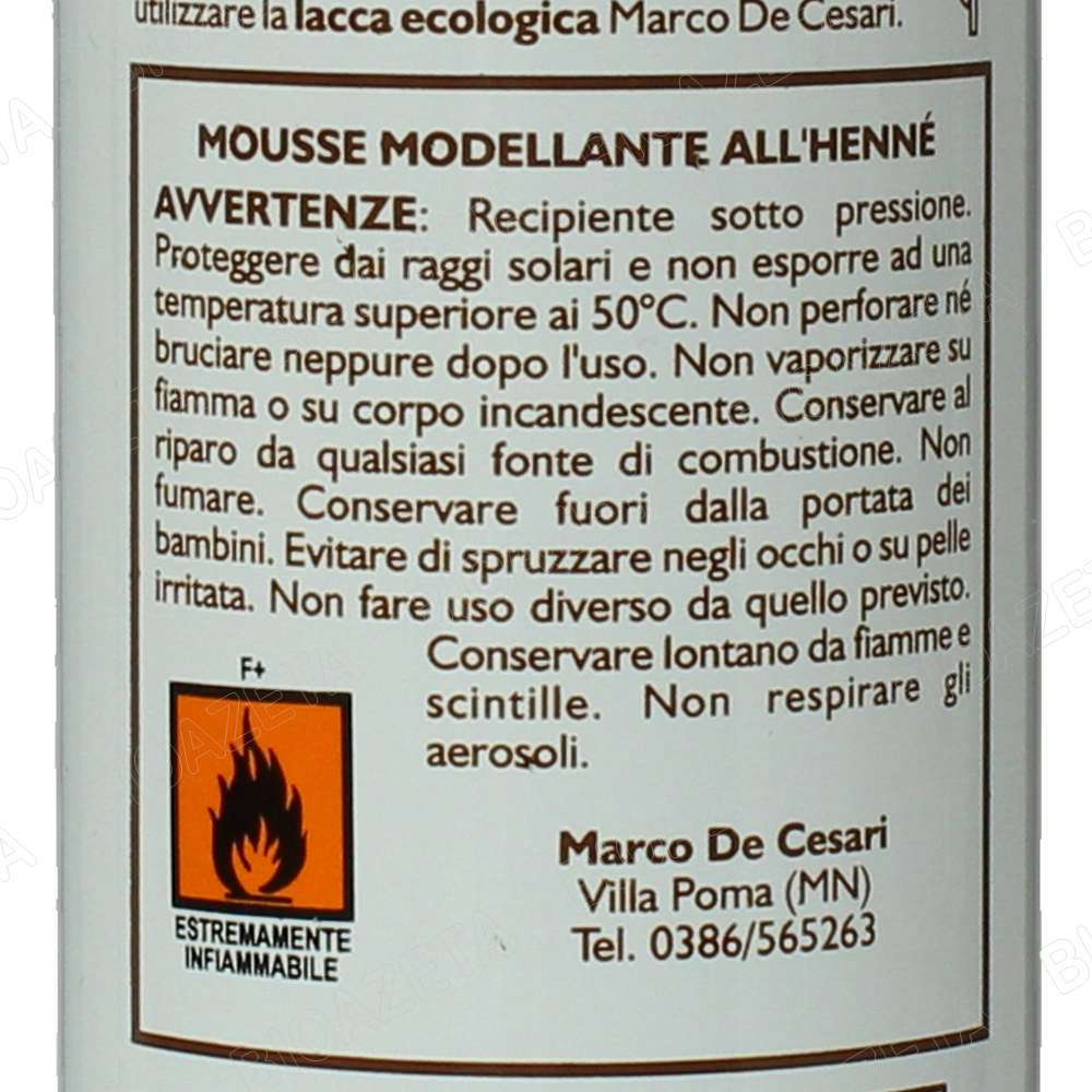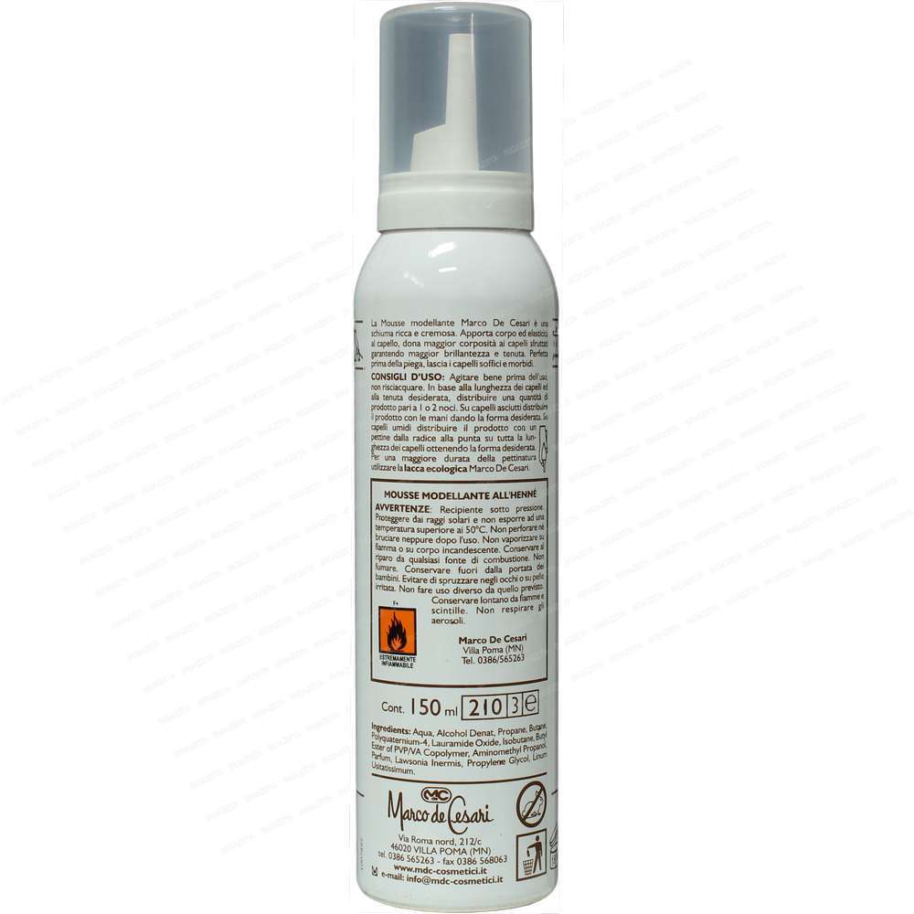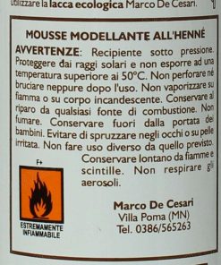Mousse modellante all’HennĂ© non colorante 150ml; La Mousse modellante all’HennĂ© Marco de Cesari è una schiuma ricca e cremosa. Apporta corpo ed elasticitĂ al capello, dona maggior corpositĂ ai capelli sfruttati garantendo maggior brillantezza e tenuta. Perfetta prima della piega, lascia i capelli soffici e morbidi. Consigli d’uso: Agitare bene prima dell’uso, non risciacquare. In base alla lunghezza dei capelli ed alla tenuta desiderata, distribuire una quantitĂ di prodotto pari a 1 o 2 noci. Su capelli asciutti distribuire il prodotto con le mani dando la forma desiderata. Su capelli umidi distribuire il prodotto con un pettine dalla radice alla punta su tutta la lunghezza dei capelli ottenendo la forma desiderata. Per una maggiore durata della pettinatura utilizzare la lacca ecologica Marco de Cesari. L’HENNE’ NON COLORANTE … la tricologia piĂą aggiornata inserita su un ceppo antico 4000 anni di esperienza… L’hennĂ© è un alberello delle regioni subtropicali, ha rami spinosi con scorza biancastra, foglie ovali acuminate, opposte, e fiori bianchi o rosei in cime terminali, soavemente profumati; il frutto è una capsula globosa. Le foglie secche, contenenti sostanze coloranti aranciate, resine, tannino, sostanze grasse e una essenza non ancora ben identificata, trovano impiego, polverizzate, nella tintura dei capelli e delle unghie. Il loro uso, comunissimo nei paesi Arabi, si è diffuso ovunque. La composizione del derivato delle foglie all’hennĂ© non è stata approfondita; esso contiene comunque: