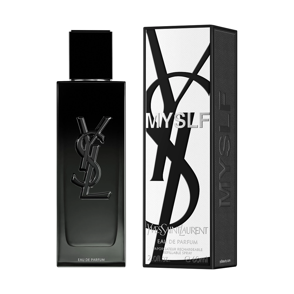 Una silhouette YSL in un flacone. Elegante. Fluido. Un monolite laccato nero con sfumature in cui ci si può vedere. Nel cuore, incastonato nel vetro, l’iconico logo YSL Cassandre. La mia essenza, MYSLF.