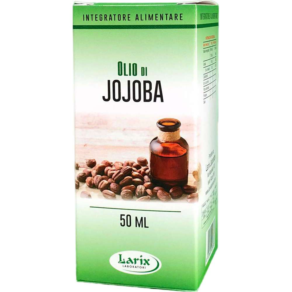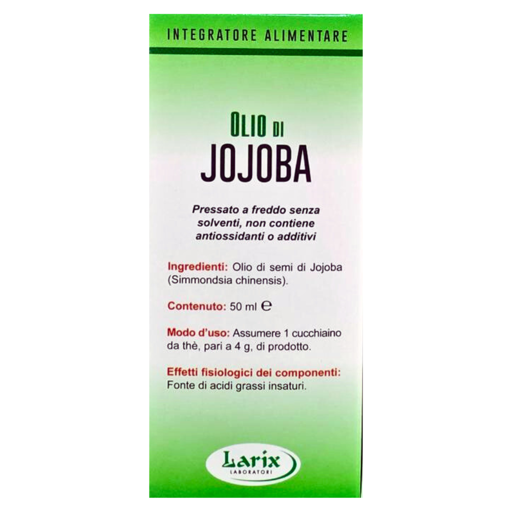 Olio di Jojoba Alimentare/Cosmetico 50ml Larix; Fonte di acidi grassi insaturi- effetto lassativo. Dai semi di simmondsia chinensis si ottiene, tramite premitura a freddo, un olio puro non adulterato che presenta una naturale affinità per la pelle. Ricco di vitamina A ed E, favorisce la rigenerazione epidermica e stimola la produzione di collagene ed elastina. Svolge una spiccata azione emolliente e nutriente e favorisce l’eliminazione delle impurità . Adatto ad ogni tipo di pelle grazie alle sua azione emolliente, nutriente ed elasticizzante. Applicato sui capelli li rende morbidi e setosi. E’ particolarmente efficace su ferite e scottature e nel trattamento preventivo delle rughe.