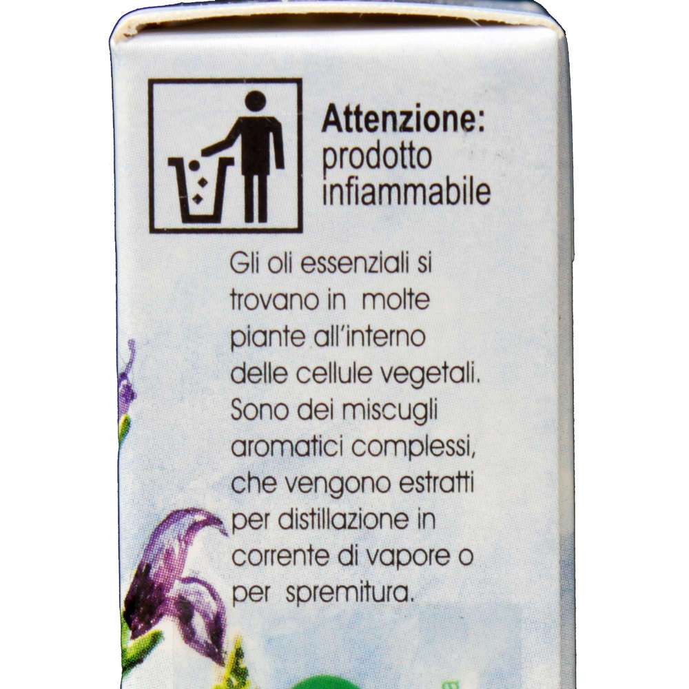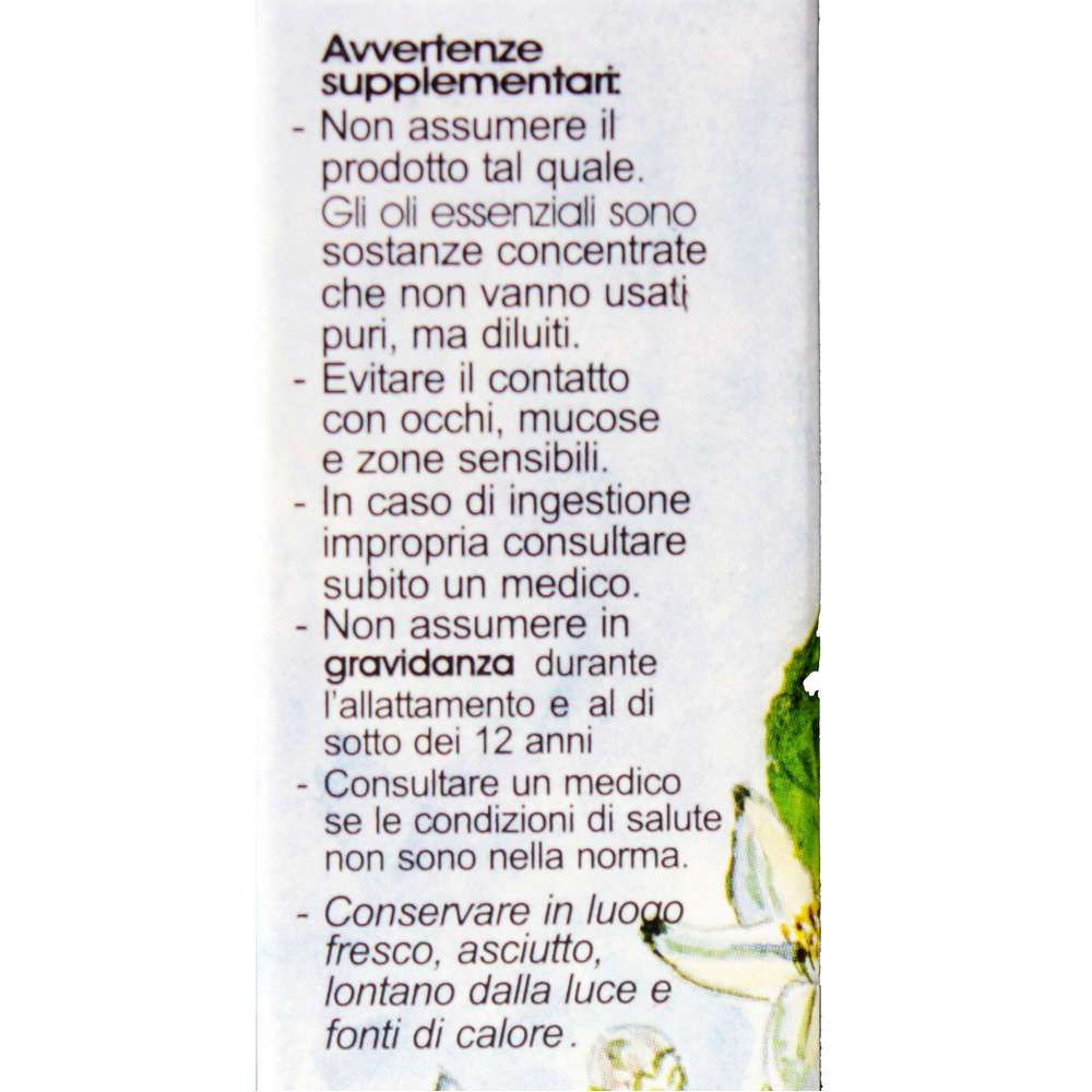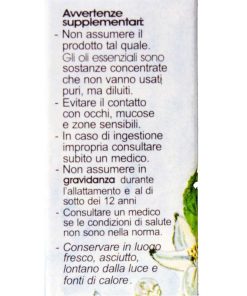 Avvertenze: Gli oli essenziali, qualunque sia il modo di assunzione, possono portare in alcuni soggetti, a fenomeni di sensibilizzazione, irritazione, tossicità . Tenere fuori dalla portata dei bambini. Non assumere il prodotto tal quale. Gli oli essenziali sono sostanze concentrate che non vanno usati puri, ma diluiti. Evitare il contatto con occhi, mucose e zone sensibili. Conservare in un luogo fresco, asciutto, lontano da fonti di calore. In caso di ingestione impropria consultare subito il medico. Si sconsiglia l’uso in gravidanza e durante l’allattamento. Prodotto infiammabile.