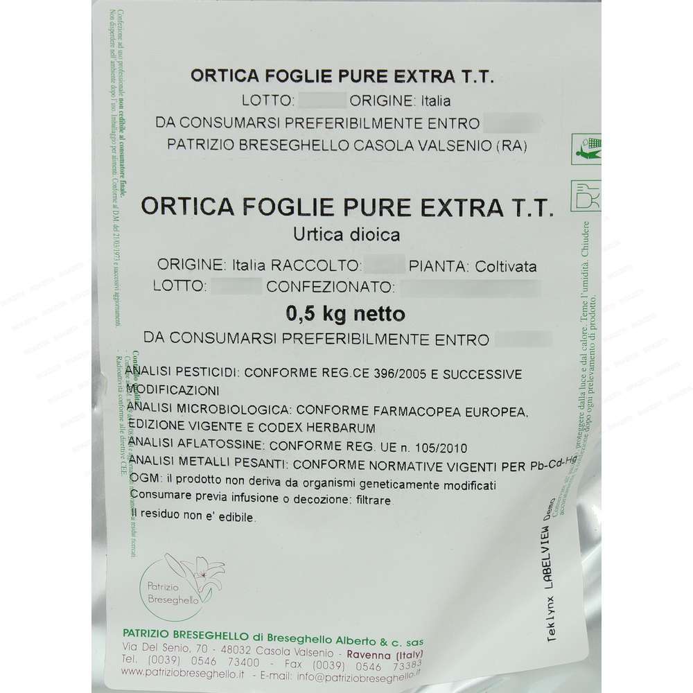 Ortica foglie pure extra Taglio Tisana 500g, La Patrizio Breseghello, azienda di importazione, lavorazione e commercializzazione di piante, ha la propria sede a Casola Valsenio, in provincia di Ravenna; il “paese delle erbe e dei frutti dimenticati”, dove 450 specie di piante officinali, fanno bella mostra di se in un Giardino delle Erbe. Fra i fattori differenziali e distintivi dell’ azienda vi sono l’approvvigionamento diretto delle materie prime (quando possibile) allo scopo di accorciare la filiera; Le tecniche di lavorazione e conservazione finalizzate all’inalterabilità dei principi attivi; la doppia cernitura (meccanizzata e a mano); la totale assenza di aromi nelle basi composte: spesso utilizzati per conferire gradevolezza al prodotto. Tutti i prodotti (piante officinali, tè e infusi, vegetali in polvere, tisane confezionate e altro), vengono controllati da un laboratorio di analisi prima di essere immessi nel mercato. Sono oltre 200 le specie botaniche selezionate e lavorate dalla Patrizio Breseghello. Ogni fase della trasformazione è condotta con la massima cura e attenzione e ha lo scopo di ottenere il miglior taglio tisana reperibile sul mercato. La cernitura a mano, tratto distintivo dell’azienda, viene effettuata successivamente a quella meccanica con l’obiettivo di rendere ancora più puro il prodotto e distinguibili gli elementi vegetali adeguatamente sminuzzati (foglie, radici, fiori, cortecce). Questa operazione permette di liberare il preparato da ogni impurità ed eventuali scorie estranee alla pianta, consentendo al cliente il triplo beneficio di una formulazione buona, naturale ed efficace. La Patrizio Breseghello attraverso il proprio laboratorio di ricerca e una conoscenza a 360 gradi delle specie vegetali utilizzate, ha ideato una linea di basi composte rispondenti alle più comuni necessità. La composizione di una tisana è una scienza! Tutte le basi di erbe aromatiche ovviamente naturali e prive di organismi geneticamente modificati, possono essere consumate anche come tisane fredde mantenendo inalterate le proprietà.