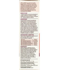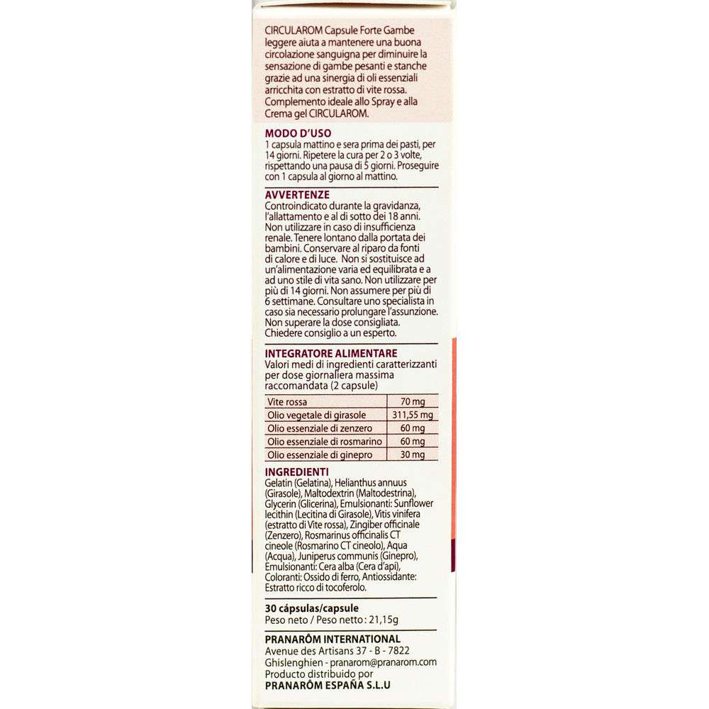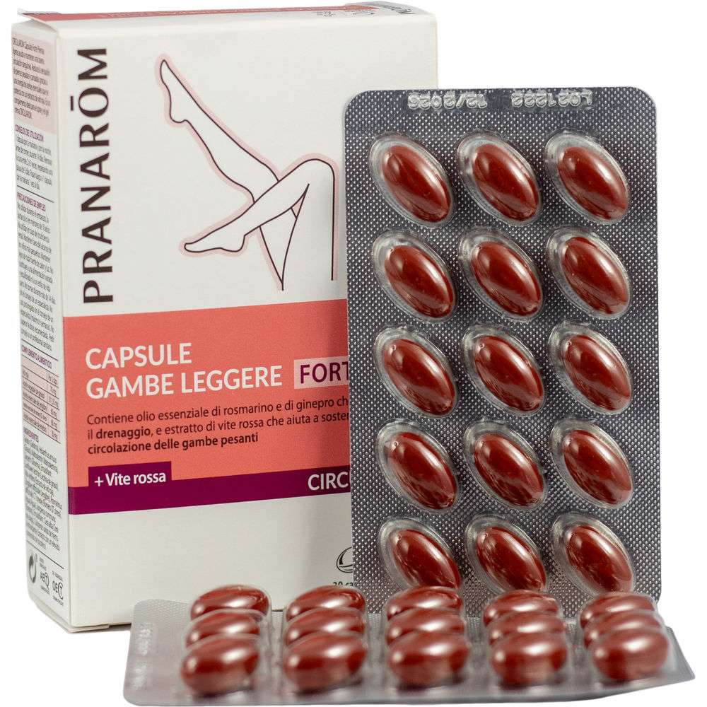 Pranarom Capsule Gambe leggere forte 30 capsule; Contengono olio essenziale di Rosmarino e di Ginepro che aiutano il drenaggio ed estratto di Vite Rossa che aiuta a sostenere la circolazione delle gambe pesanti.