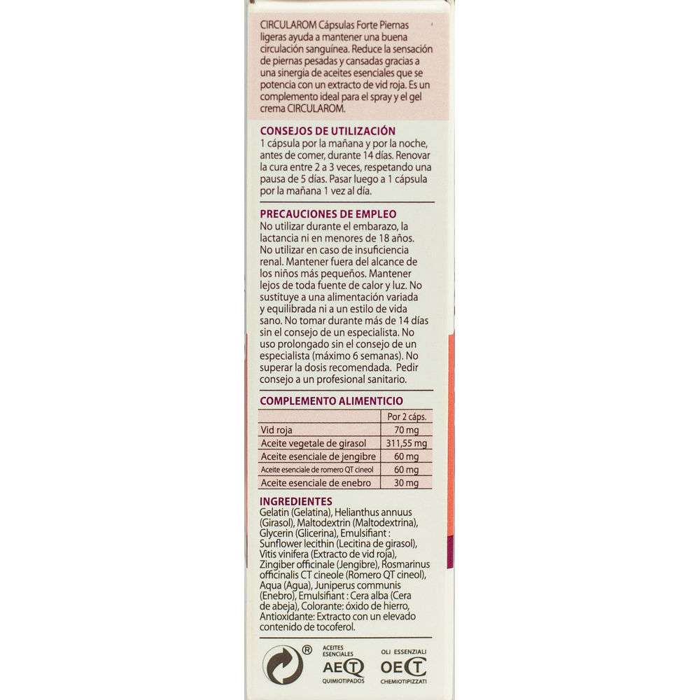 CIRCULAROM Capsule Forte Gambe leggere aiuta a mantenere una buona circolazione sanguigna per diminuire la sensazione di gambe gonfie, pesanti e stanche grazie a ad una sinergia di oli essenziali arricchita con un estratto di vite rossa. Complemento ideale allo Spray e alla Crema in gel CIRCULAROM.
