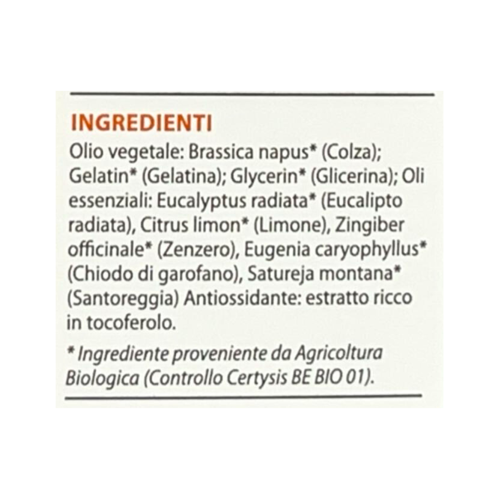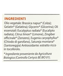 - Oli essenziali: Eucalyptus radiata* (Eucalipto radiata), Citrus limon* (Limone), Zingiber officinale* (Zenzero), Eugenia caryophyllus* (Chiodo di garofano), Satureja montana* (Santoreggia);