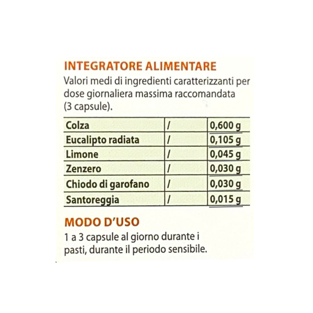 Modo d’uso: 1 a 3 capsule al giorno durante i pasti, durante il periodo sensibile.