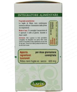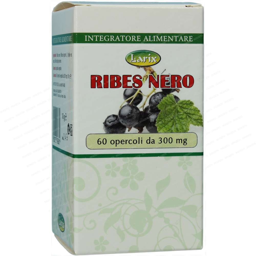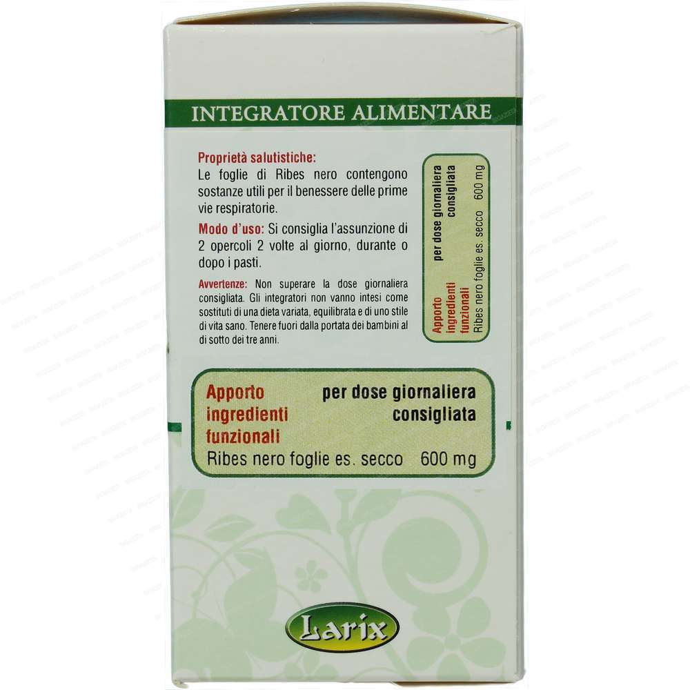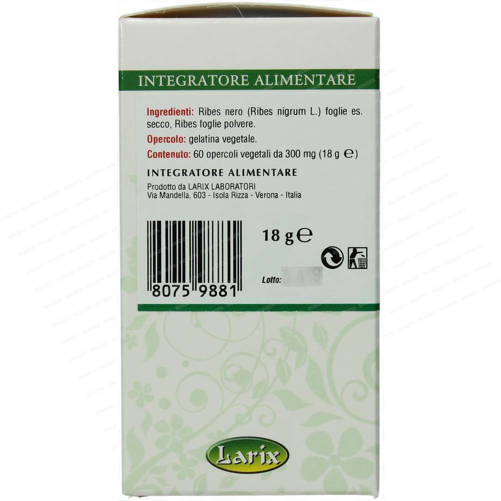 Ribes nero 60 capsule Larix; Ingredienti per opercolo: Ribes nero (Ribes nigrum L.) foglie es. secco, Ribes nero foglie polvere.
