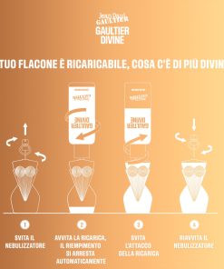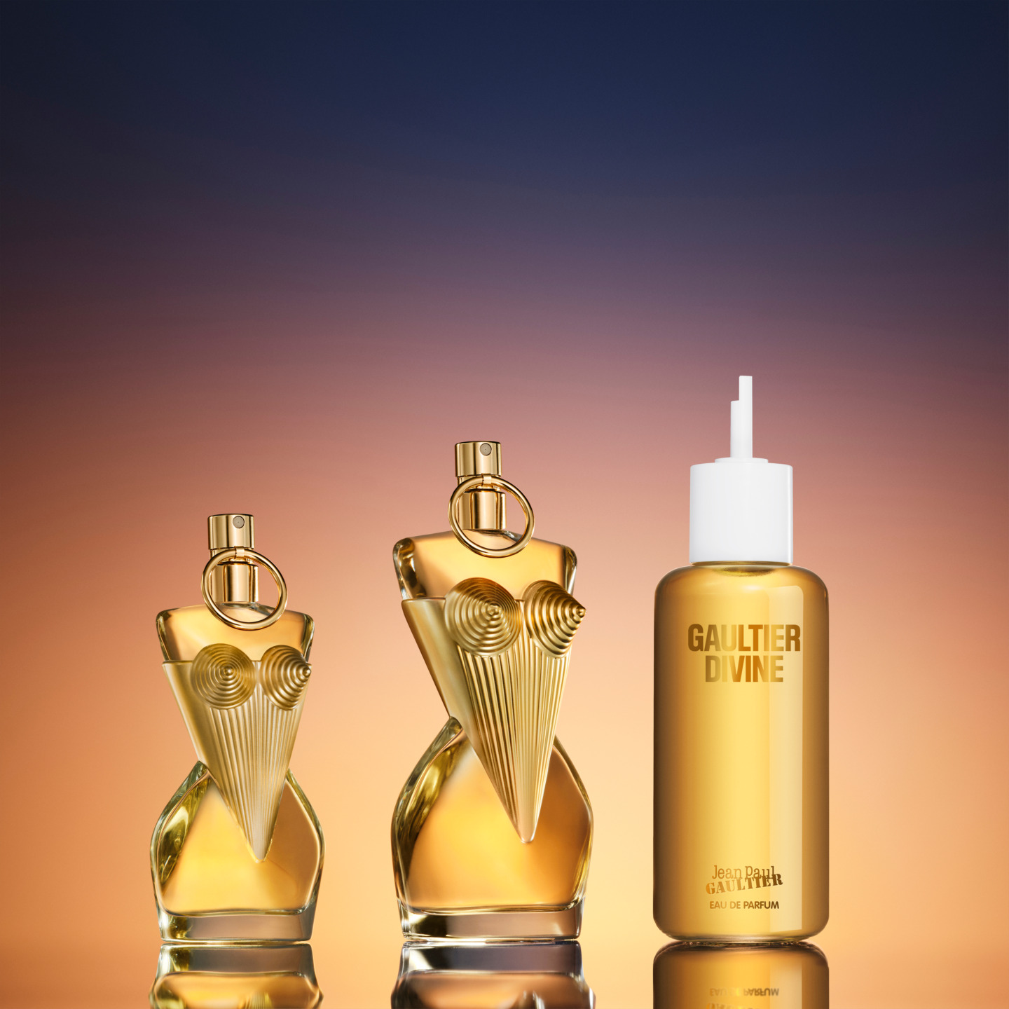 Jean Paul Gaultier celebra le donne e si impegna per l’ambiente offrendo un flacone ricaricabile alla sua nuova creazione: Gaultier Divine Eau de Parfum. Dotato di un sistema svitabile auto-stop, questa ricarica ecologica permette di riempire il flacone da 50 ml o da 100 ml, senza perdere una goccia del prezioso profumo. Un gesto eco-responsabile con cui si risparmiano il 52% di vetro e il 66% di metallo, usando un flacone Gaultier Divine 50 ml con la ricarica da 200 ml, rispetto a 5 flaconi di Gaultier Divine da 50 ml.