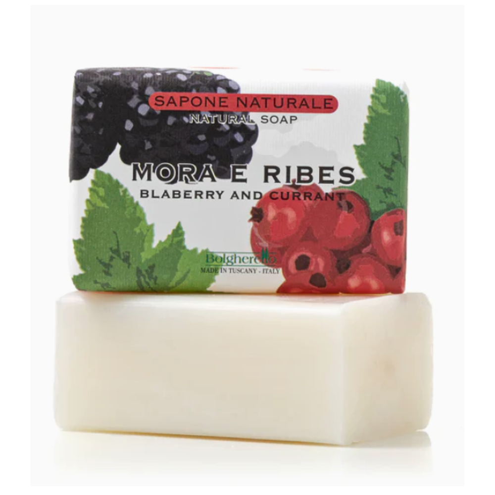 Sapone 200g Mora e Ribes Bolgherello; Questo sapone naturale detergerà con dolcezza la vostra pelle attraverso la sua schiuma leggera, assicurandovi una sensazione di immediato benessere ad ogni risciacquo.