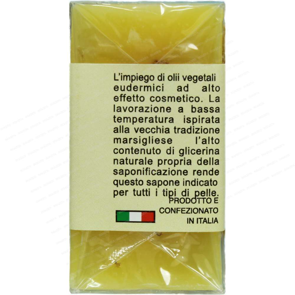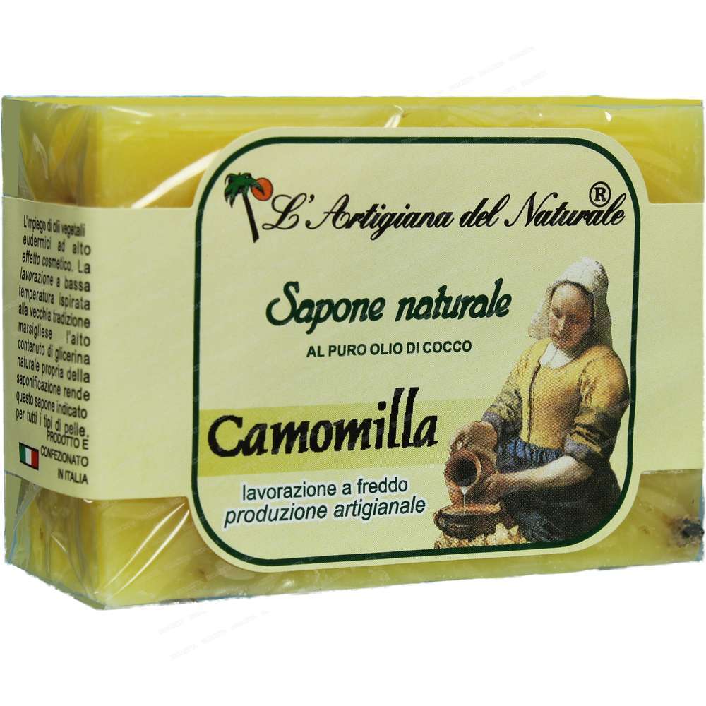 Sapone artigianale a base di olio di cocco con estratto e fiori di camomilla.