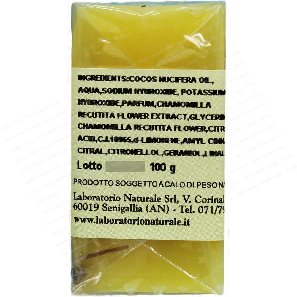Ingredienti: Cocos nucifera oil, Aqua, Sodium hydroxide, Parfum, Chamomilla recutita flower extract, Chamomilla recutita flower, Glycerin, Potassium hydroxide, Tetrasodium glutamate diacetate, Citric acid, Potassium sorbate, Sodium benzoate, Amyl cinnamal, Citral, Citronellol, Geraniol, Hexyl cinnamal, Limonene, Linalool, CI 18965.