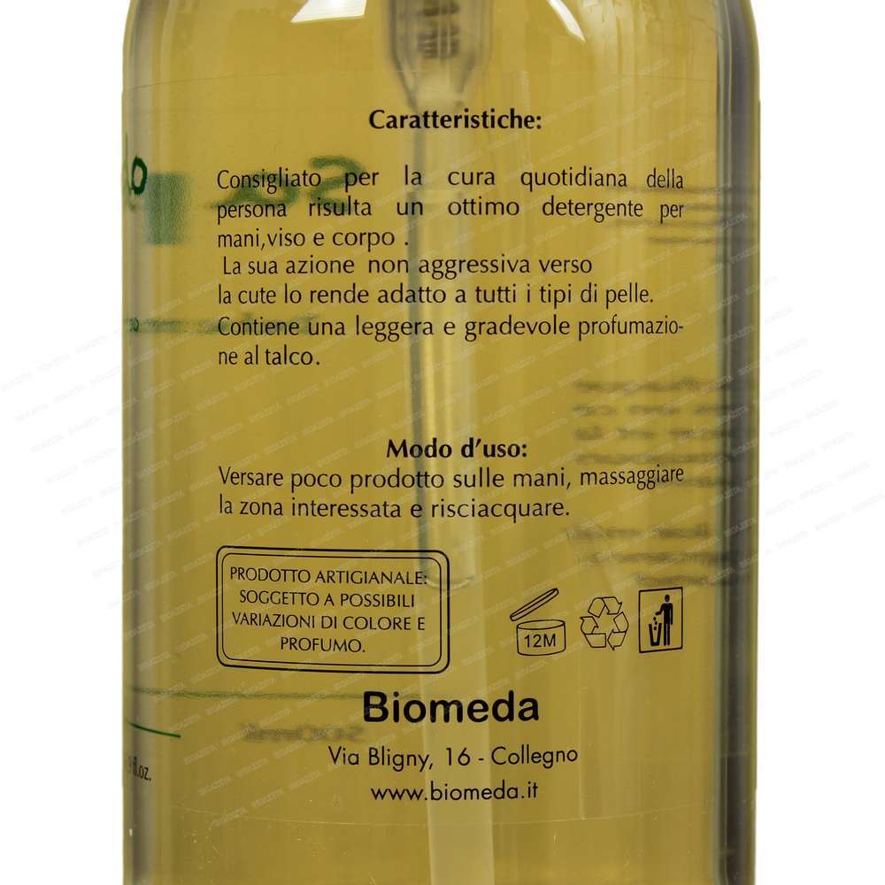 Sapone liquido talco 500ml Biomeda; Delicato e soffice sapone, adatto all’igiene di tutta la famiglia.