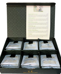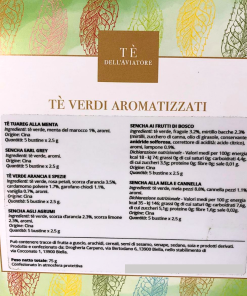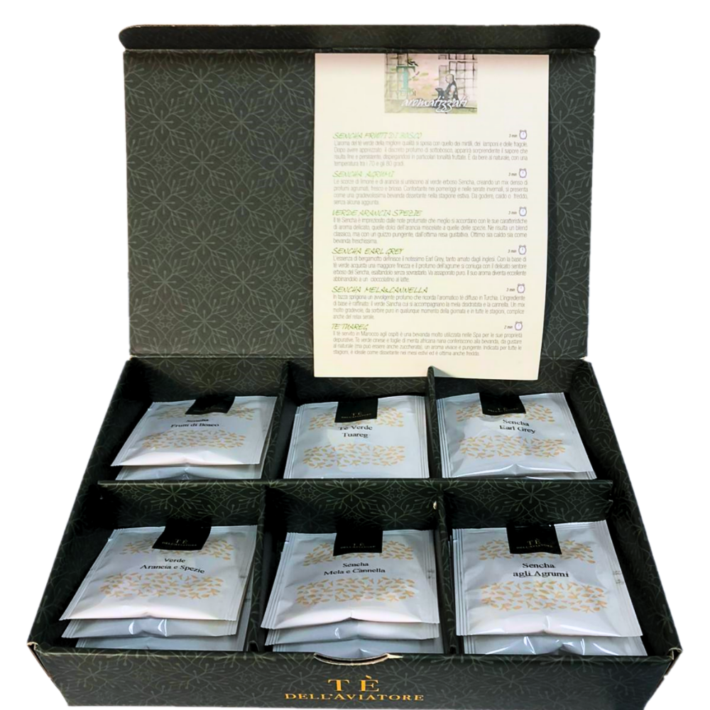 La bellissima scatola regalo contiene: 5 Filtri Tè Tuareg alla Menta (Tè verde e menta), 5 Filtri Tè Sencha Earl Grey, 5 Filtri Tè Verde Arancia e Spezie, 5 Filtri Tè Sencha agli Agrumi (con scorze di arancia e limone), 5 Filtri Tè Sencha Mela e Cannella, 5 Filtri Tè Sencha ai Frutti di Bosco (Tè Verde, fragole, bacche mirtillo, lampone e aromi). tè verde
