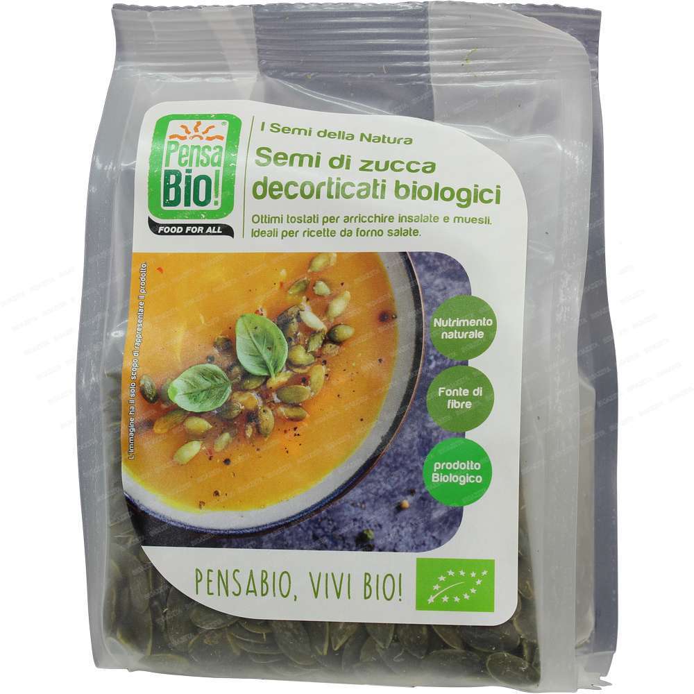 Semi di zucca sgusciati bio 200g Pensa bio; Se tostati in padella antiaderente sono ottimi come snack o per aggiungere un tocco di sapore a insalate e zuppe. Perfetti per guarnire panini e salatini, si prestano bene anche aggiunti al muesli o direttamente nello yogurt. Nutrimento naturale. Fonte di fibre.