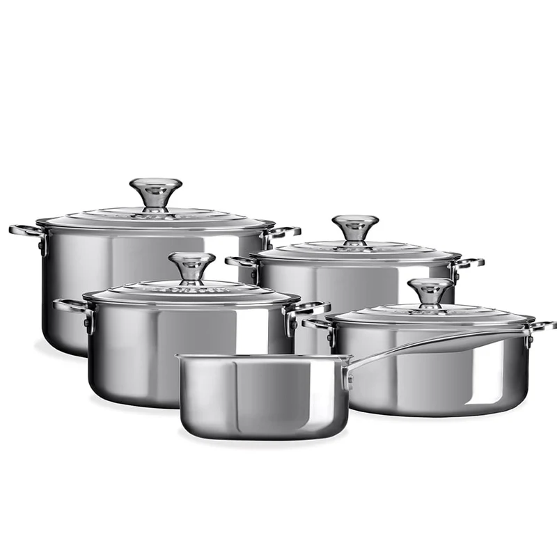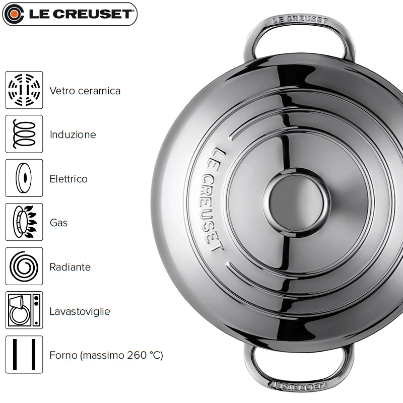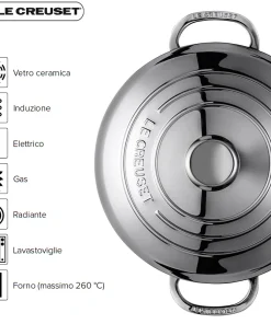 Il set di casseruole Le Creuset soddisfa le esigenze culinarie grazie alla combinazione di acciaio inox 18/10 e una struttura a tre strati con nucleo in alluminio, che assicura una distribuzione uniforme del calore. Le maniglie ergonomiche e isolate riducono l’effetto del calore, migliorando la sicurezza d’uso. Il design innovativo include coperchi con sfogo vapore e bordi anti-gocciolamento. Compatibili con tutte le fonti di calore, sono facili da pulire e possono essere lavate in lavastoviglie, garantendo durabilità. Made in Portugal, rappresentano la sintesi di qualità e funzionalità.